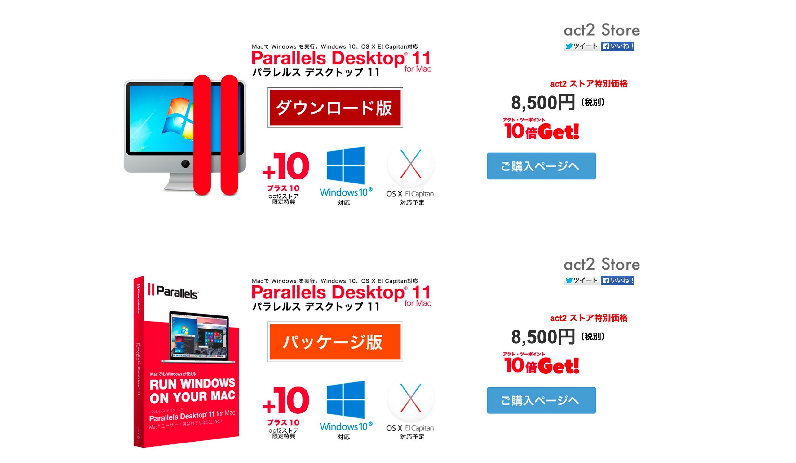 act 2 ストアではParallels Desktop 10 for MacからParallels Desktop 11 for Macへのアップグレード版は販売していないので、アップグレード版が必要な方はParallelsへどうぞ。