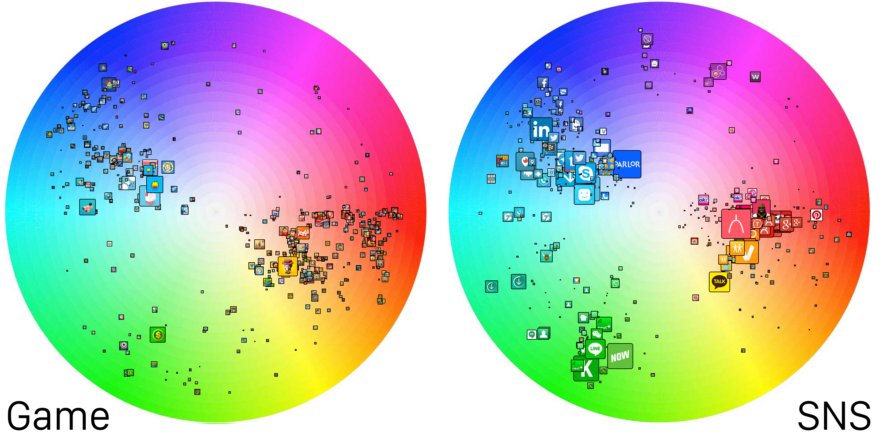 色の傾向が良く出ているのがカテゴリ別のプロットで、ゲームとSNSアプリアイコンに使用されている色を比較すると、ゲームアプリのアイコンはキャラクターや文字が多く含まれているため1つのアイコンに占める色の割合は小さく、SNSアプリのアイコンは逆に単色系が多く安心を与える緑の色のアイコンが多いことが分かります。