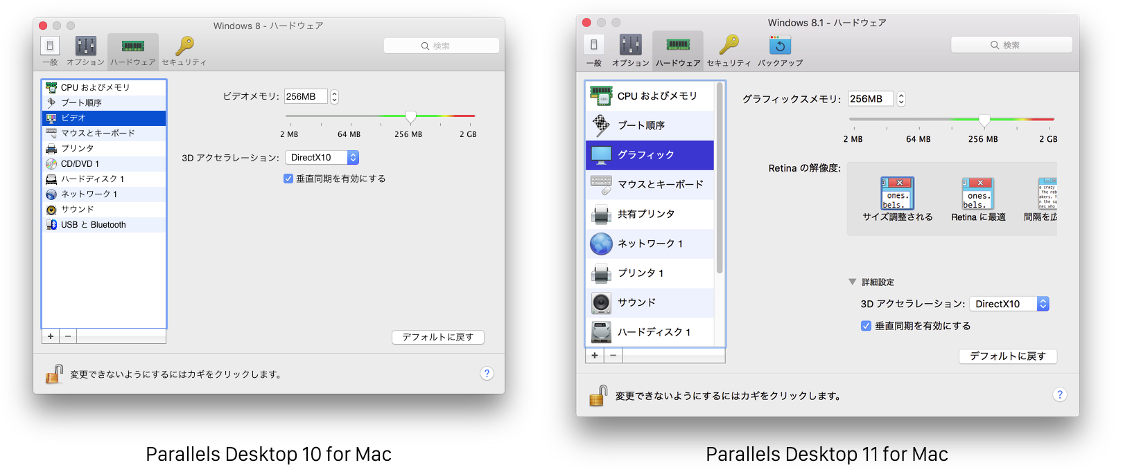 バージョン11からゲストOSとしてWindowsを使用する場合、ハードウェアのグラフィックス項目から「Retinaの解像度」設定が可能になり、OS Xと同様「サイズ調整される」「Retinaに最適」「間隔を広げる」のオプションが設定できるようになっています。