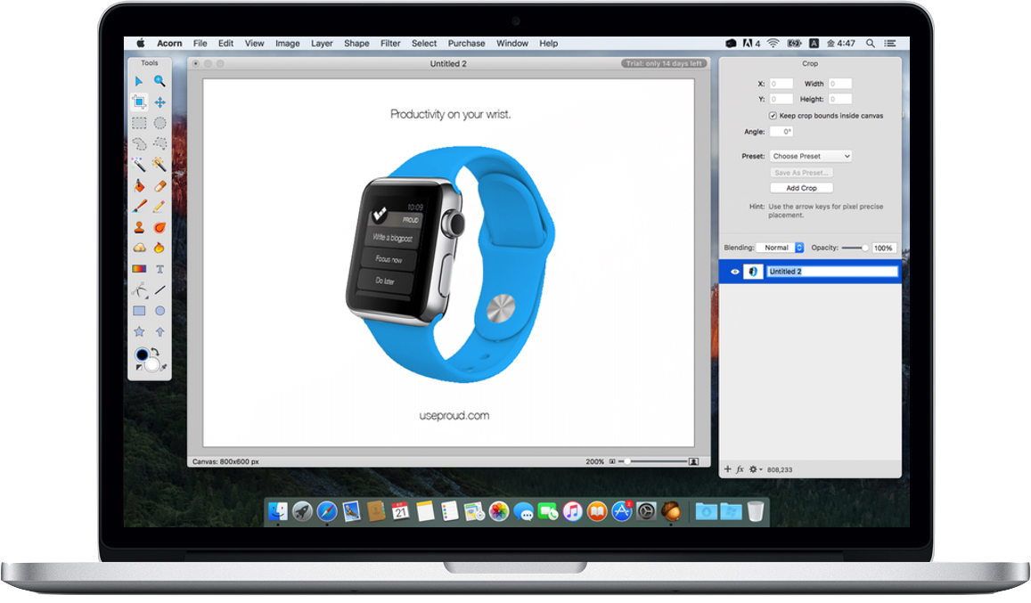 Acorn 5からシステム要件がOS X 10.10 Yosemite以上に設定されていますが、Flying Meat Inc.の公式サイトでは2週間(14日間)限定で全ての機能が試用可能なトライアル版も同時に配布開始しているので、興味がある方は関連リンクからどうぞ。