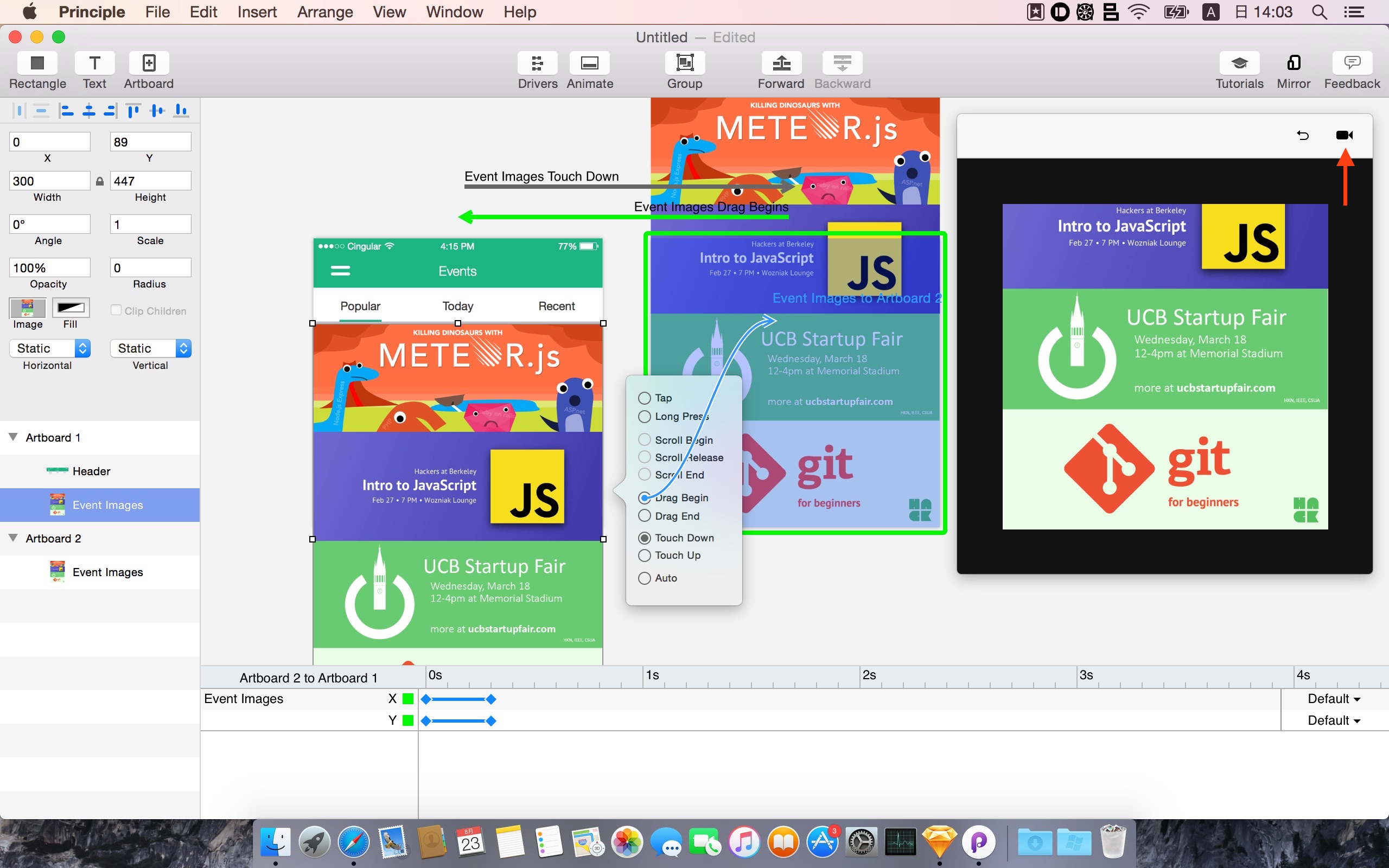 プロモーション動画の「5分あればプロトタイプ・アニメーションを作れる」というメッセージの通り、アプリのデザインイメージさえあればアートボードにイメージをインポートし、レイヤーを選択、タッチジェスチャーを選択するだけでアクションが完成します。