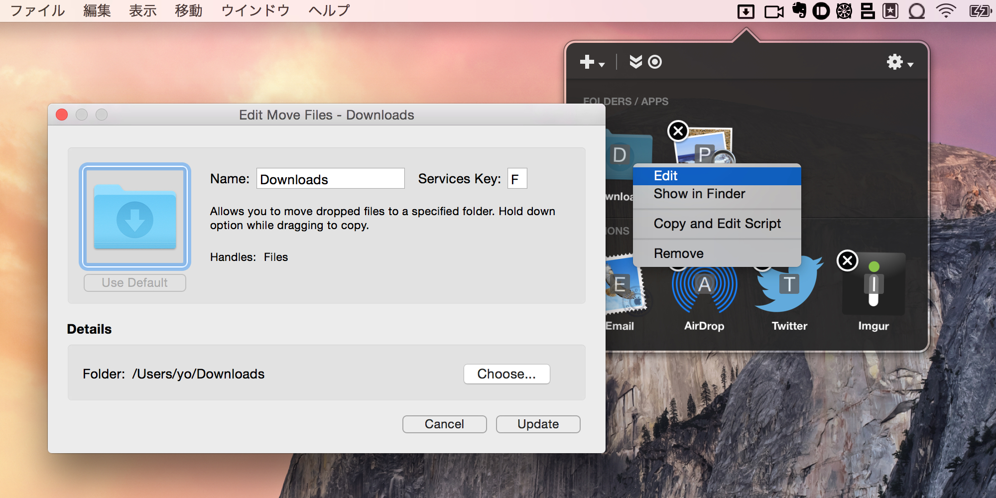 ショートカットキーはユーザー自身で変更可能で、ファイルを選択した状態で[Ctrl+Option+Cmd+D]を押すことでファイルを他のアプリやフォルダに渡すアクションもサポートされています。アクションはDropzone APIを利用し作成することも可能で、Dropzoneが公開しているアクションもあります