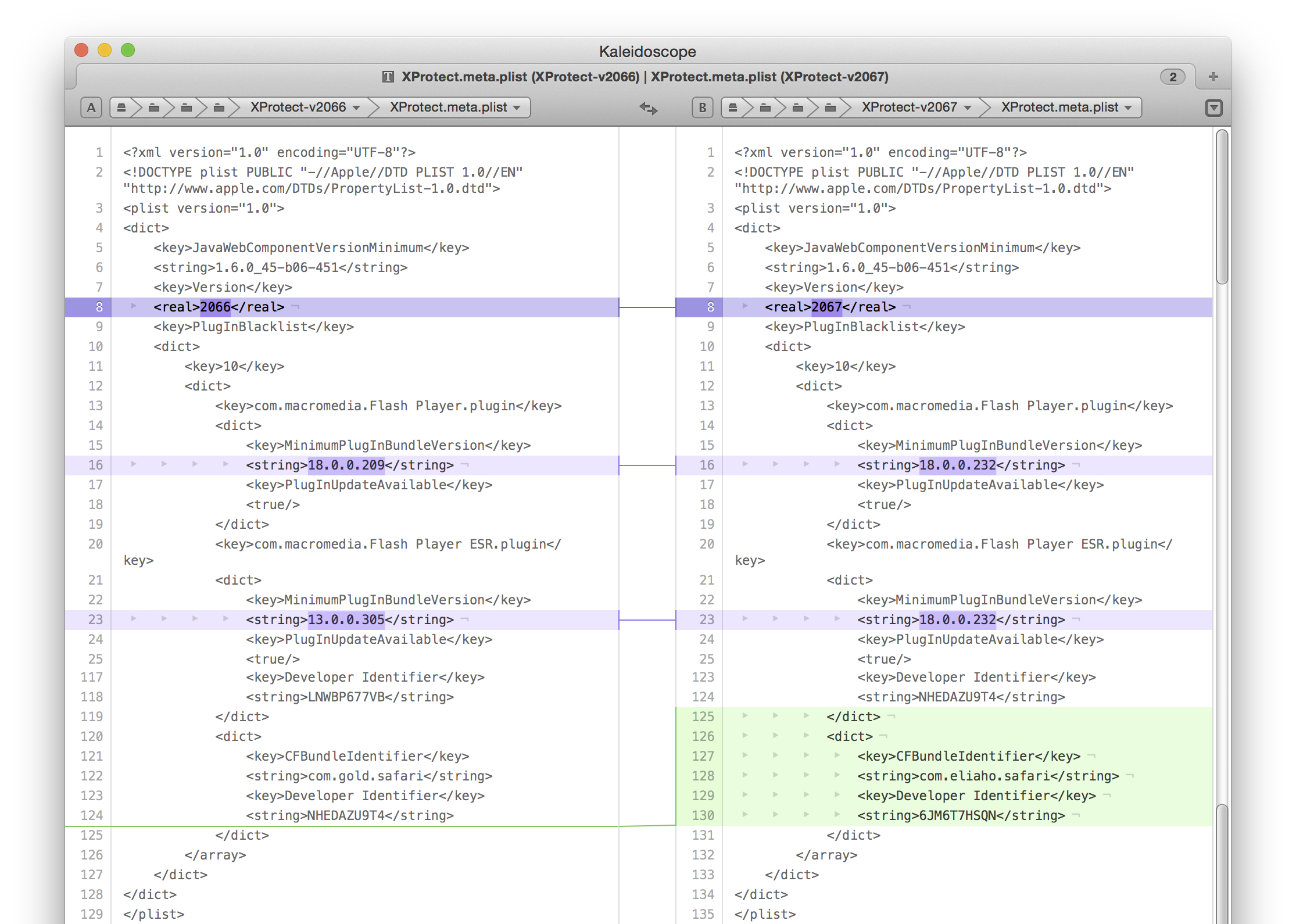 またSafariのセキュリティを担う”XProtect.meta.plist”ではSafariのFlash Player PluginがFlash Player および Flash Player ESRとも最新の18.0.0.232以外をブロックし、com.eliaho.safari製のプラグインをブロックしています。
