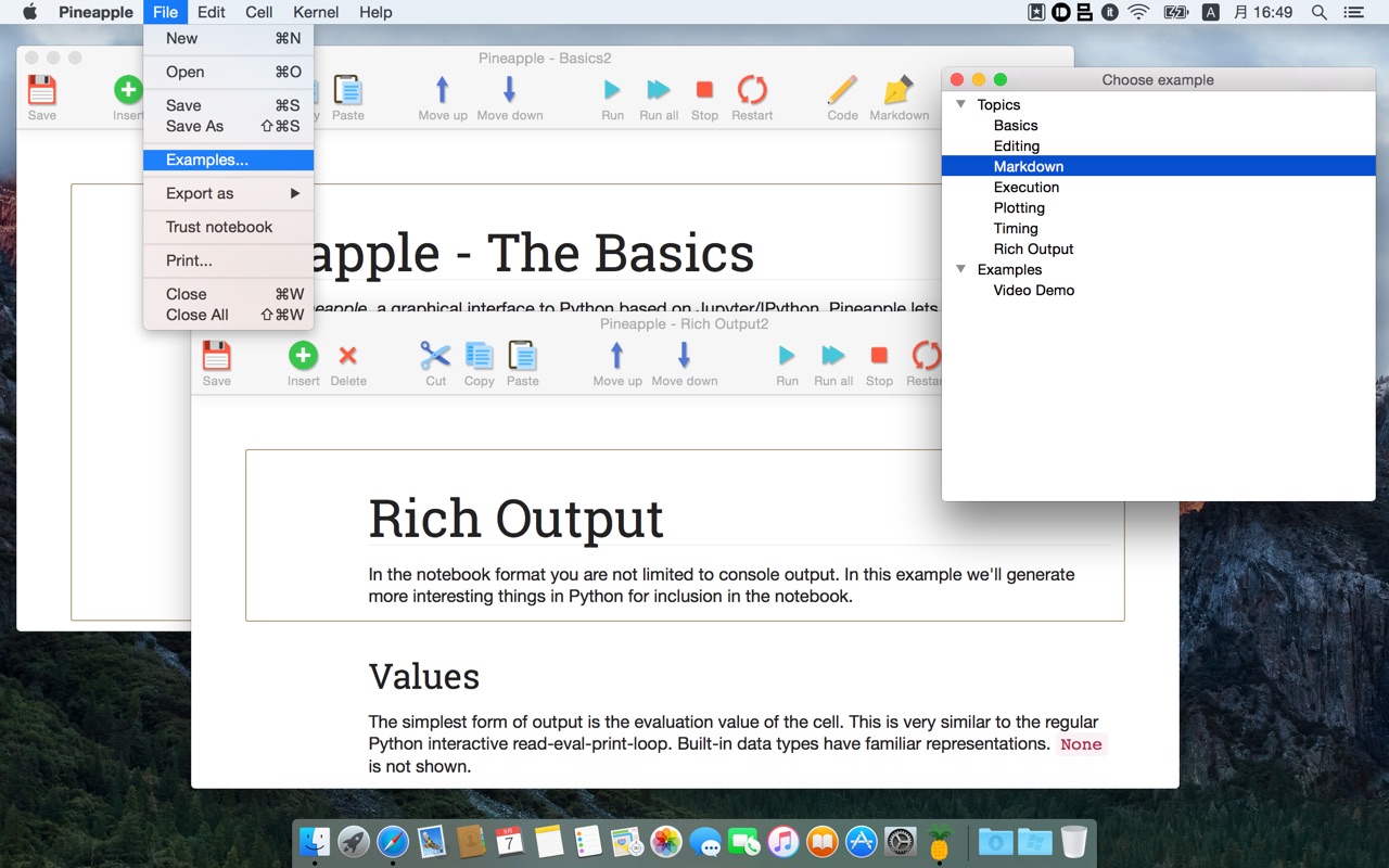PineappleはMac用ネイティブアプリとしてパッケージ化されていますが、g++-4.9コンパイラーとwxWidgetsなどをインストールすればUbuntuでもbuildすることが可能だそうです。使い方については[File]メニューの[Example]に詳しく記載されており、実行結果のPython,HTML,Markdownへの書出し、キーボードショートカットなども利用可能です。