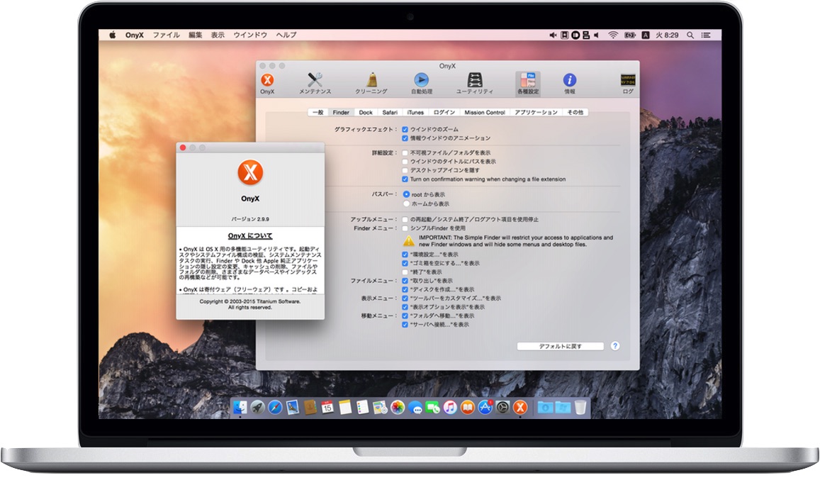 またOnyXを開発しているフランスのTitanium SoftwareはOS X 10.11 El Capitanのサポートも表明しており、El Capitanリリース後 OnyX for El Capitanを公開すると発表しています(OnyXにはバージョンチェック機能があるので、各バージョンは各OSでしか起動しません)。