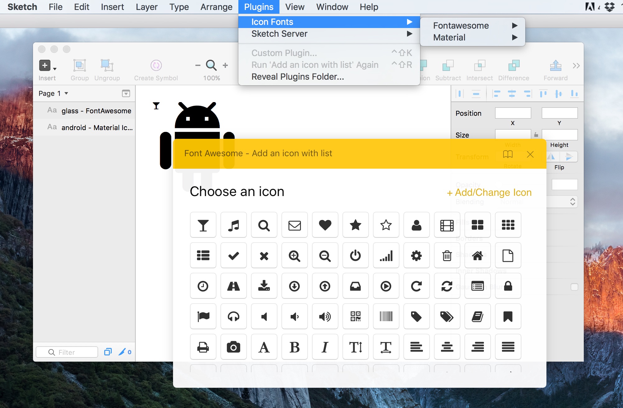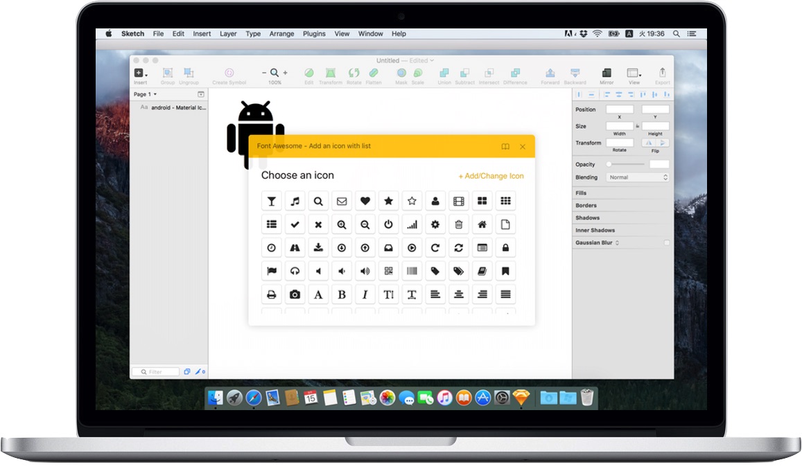 最後にGitHubかSketch ToolboxからSketch Iconfontプラグインをインストールし、Pluginメニューから[Icon Fonts]を選択すればMaterial IconsとFont Awesomeのアイコンを表示、Sketchで利用することが可能です。