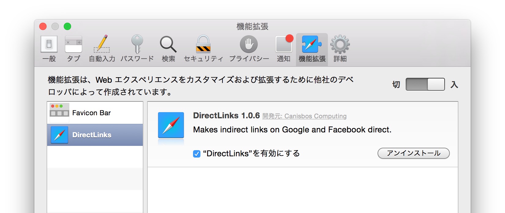 Googleの検索結果やFacebookのシェアリンクに含まれるURLは実際のURLではなくトラッキングたのめ置き換えられていますが、Canisbos Computingが開発&公開している Safariの機能拡張”DirectLinks”はこのURLを正しいURLに置き換えてくれます。