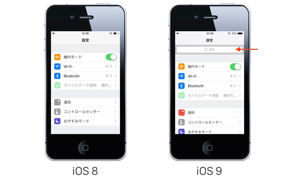iOS 9の設定アプリはOS Xのシステム環境設定のように、設定項目を検索しアクセス可能になっています。詳細は以下から。