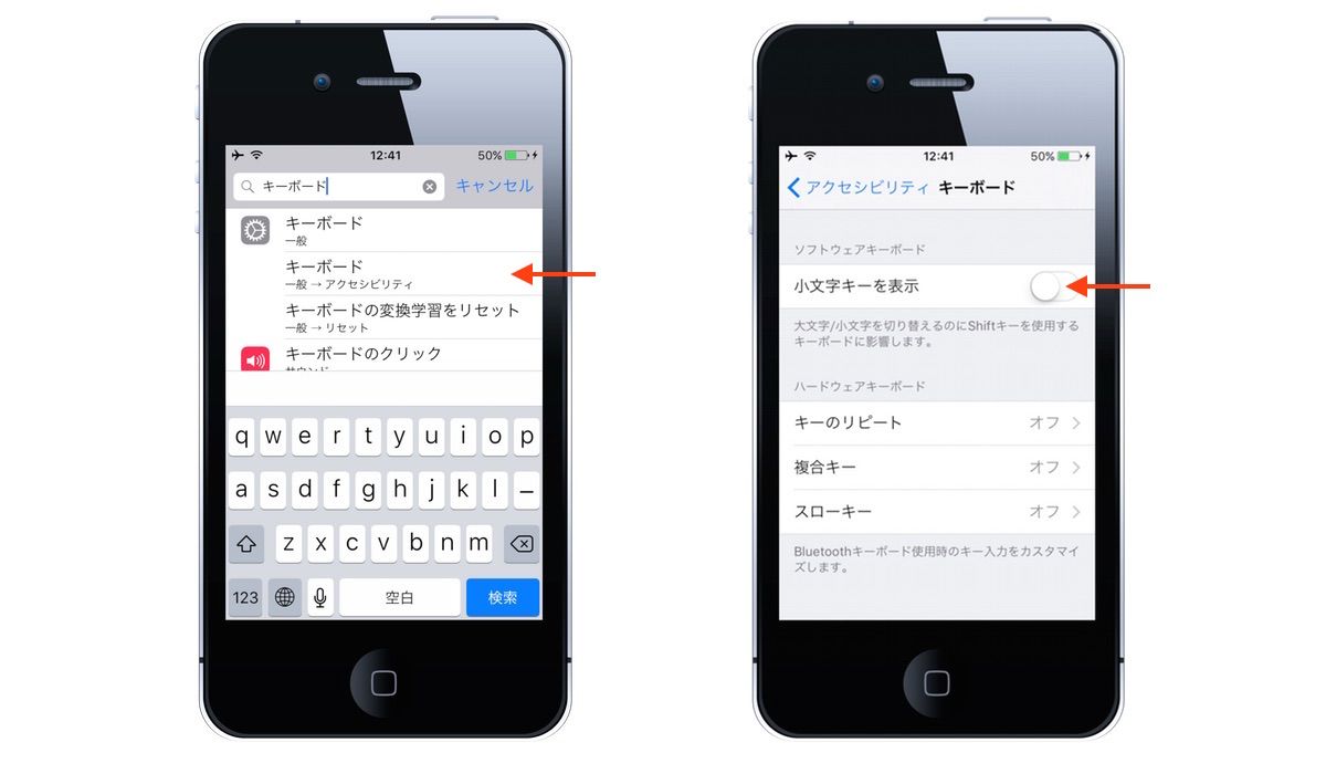 Daring Fireballによると、Appleは[Shift]キーや[Caps]キーを押した時にキーボードがチラつくこの効果をOFFにしiOS 8と同じキーボードにする設定を用意しているそうです。設定方法はiOSの設定アプリから[一般] > [キーボード] > [アクセシビリティ]へ移動し「小文字キーを表示」をOFFにすればiOS 8と同じ大文字のみのキーボードが利用できます。
