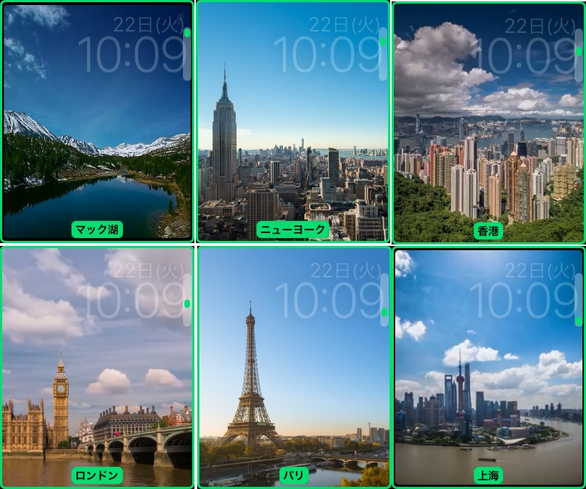 タイムラプス文字盤はAppleが24時間にわたって撮影したマック湖、ニューヨーク、香港、ロンドン、パリ、上海の6箇所で、設定方法は通常の文字盤と同じで文字盤を強く押し、タイムラプス文字盤を選択、Digital Crownを回すことで場所を変更できます。