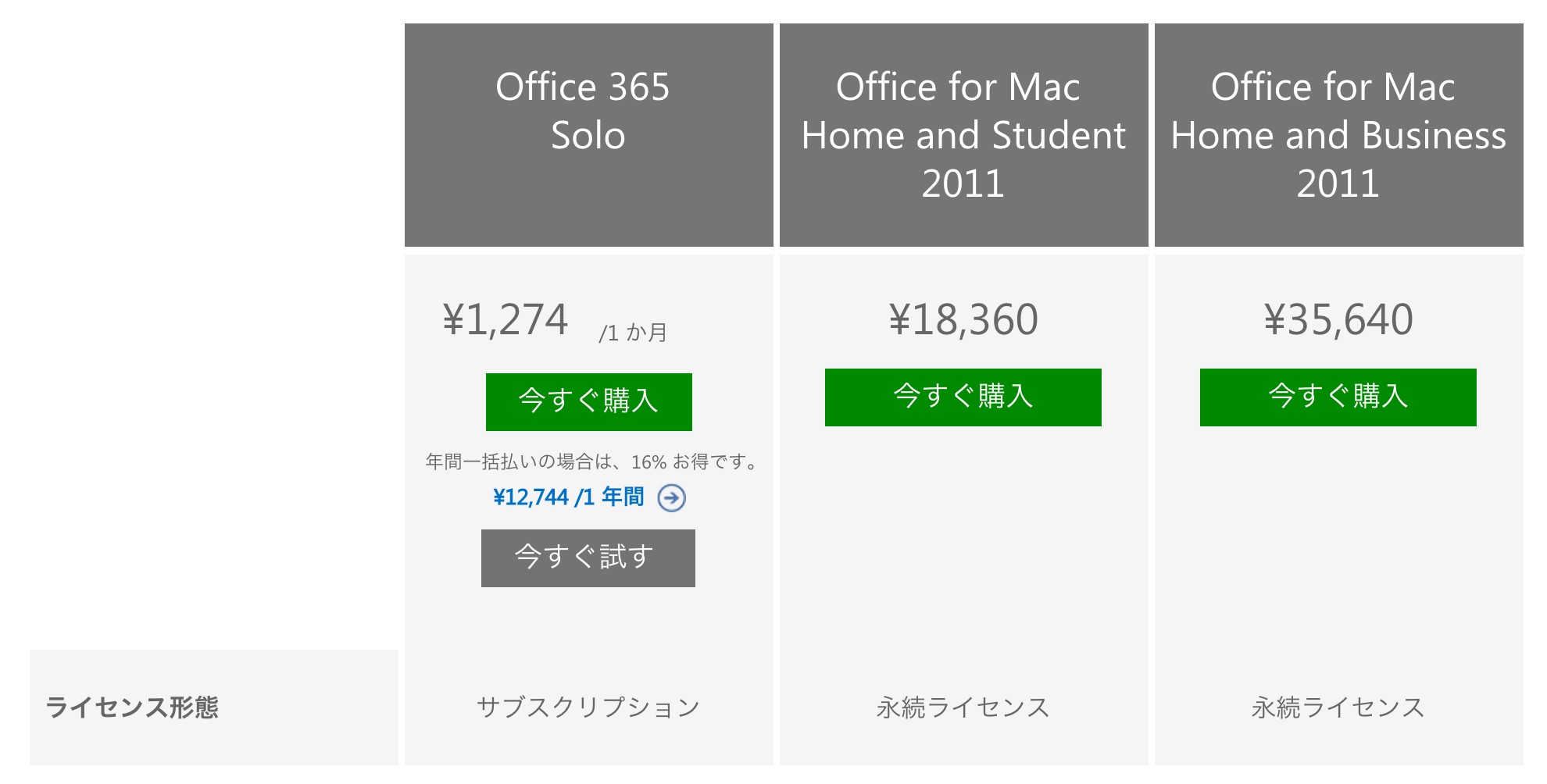 もともとHome & Student 2011にはOutlookは付属してなかったし、365に付属しているPublisherとAccessはWindows版の使用権(365のOS非依存ライセンスの特徴)にすぎない=365を契約してもMac版PublisherとAccessが使える訳じゃないんだから、永続ライセンス版が2011と比較して機能削減されているかのように錯覚させる書き方はやめたほうがいいんじゃないかなあ。しかもOneDriveの15GBってアカウント持ってれば誰でも使える無償ストレージでしょ、Officeに追加で付いてくるわけじゃないんだからその書き方は無いでしょう。