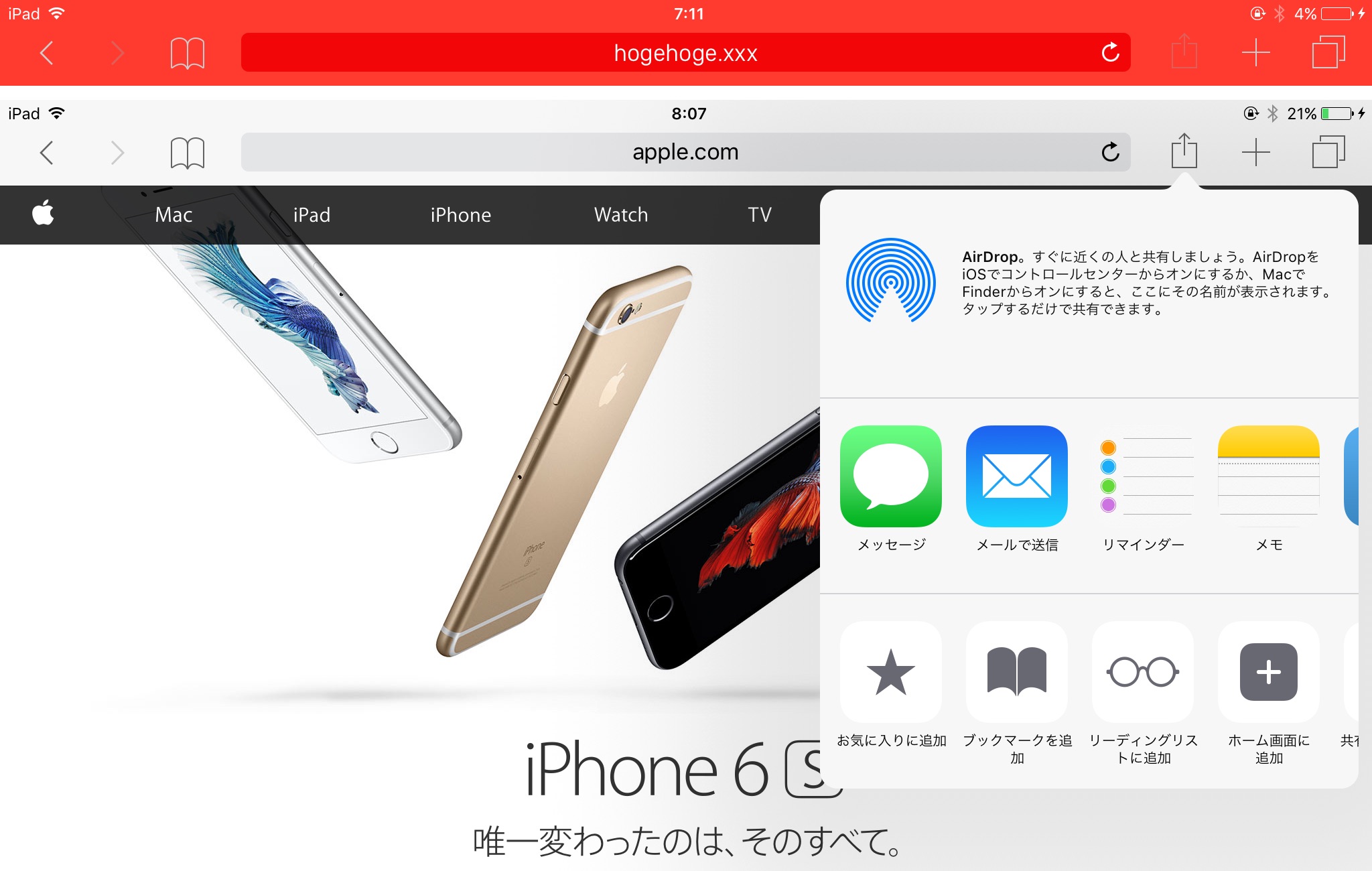AppleはiOS 9に搭載したSafari 9でこのようなフィッシングサイトに接続すると以下のようにSafariのアドレス、ツールバーの色を赤くし「フィッシングサイトの疑い」という警告を出し、読み込みを中止する新機能を追加しています。