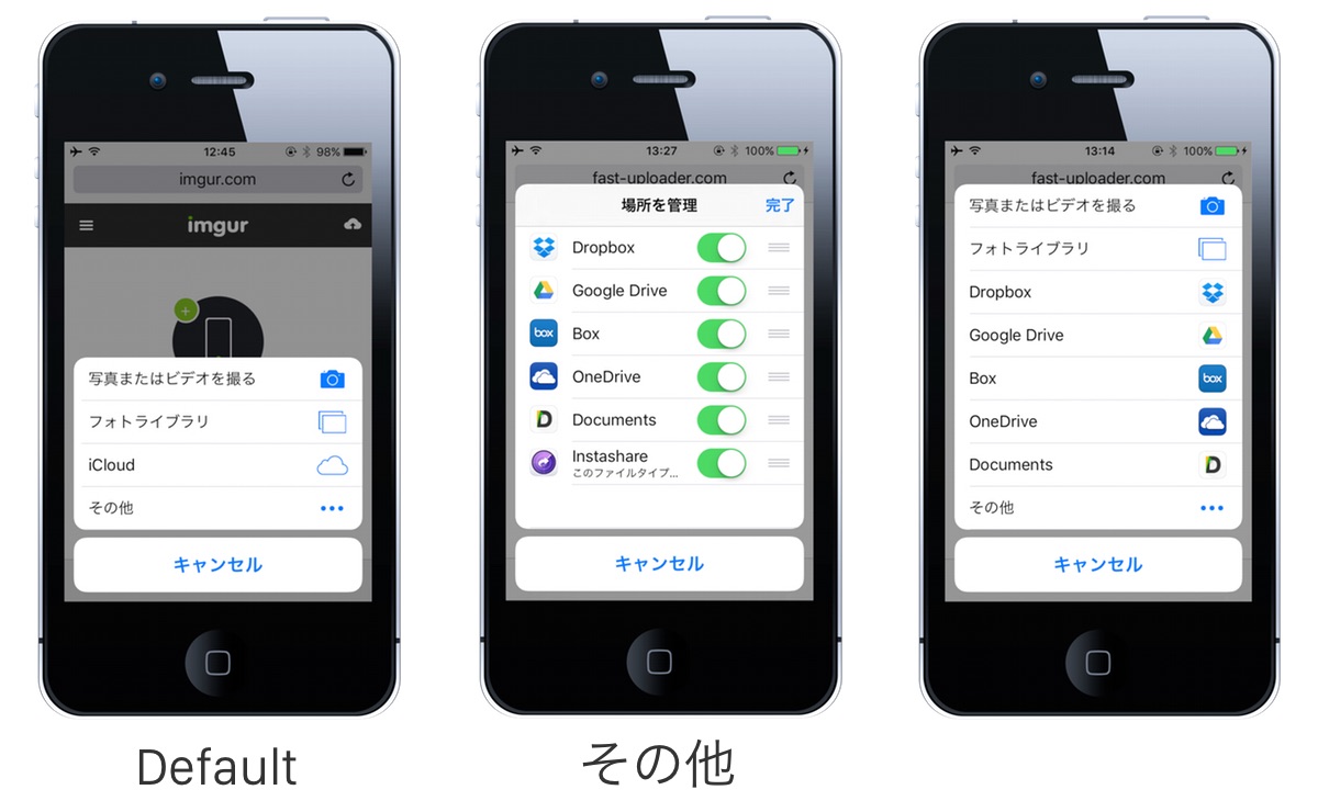 デフォルトではファイルはカメラ、フォトライブラリおよびiCloud Driveとなっていますが、Appleはサードパーティ製アプリにもこの機能拡張を開放しているので、既にDropboxやGoogle Drive, Box, OneDrive, Documents, Instashareなどのアプリが対応しています。