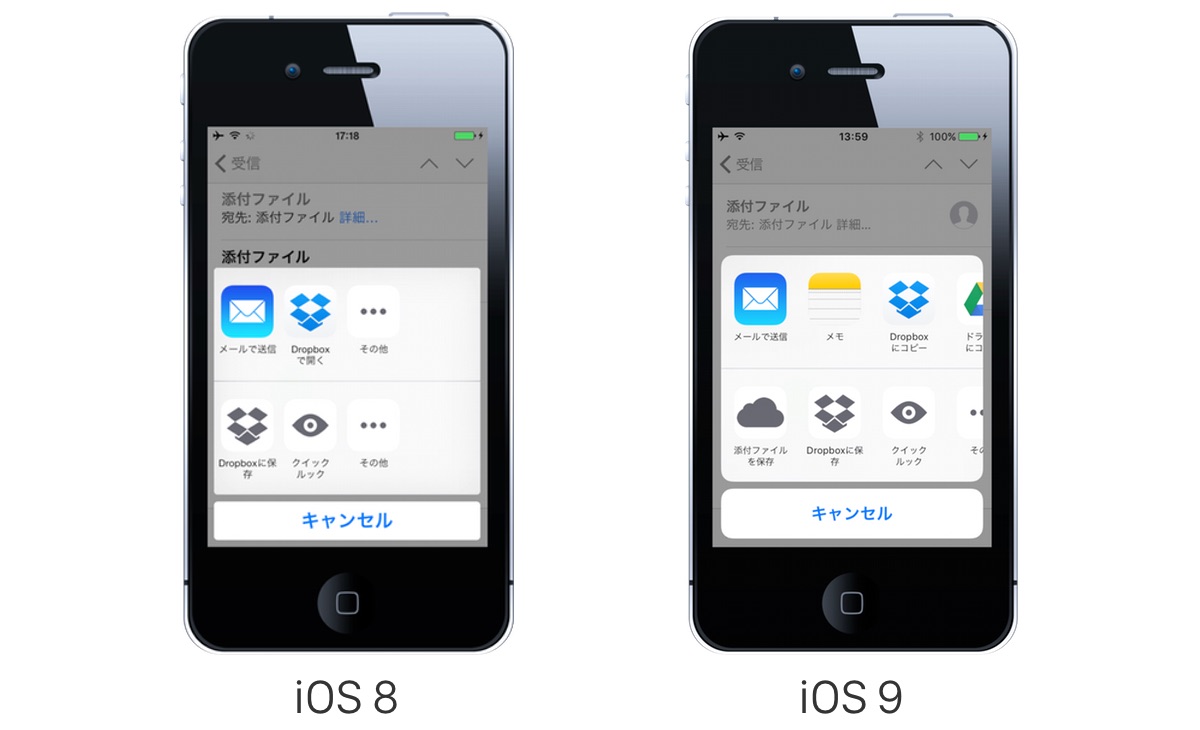 この機能は既にDropboxなどがiOS 8の新機能”App Extensions”を利用し提供していましたが、iOS 9ではiCloud Driveでも利用可能になっており、添付ファイルをタップし、Extensionsの[添付ファイルを保存]を選択、添付ファイルを保存するiCloud Driveのフォルダを選択すればファイルが保存されます。