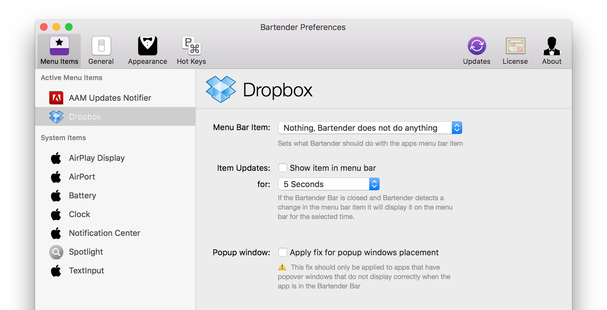 Bartenderはアプリケーションメニューがメニューバーに表示され、ステータスメニューが表示できない問題を解決してくれるユーティリティアプリで、アプリ独自のメニューバーにステータスメニューアイコンを表示してくれます。