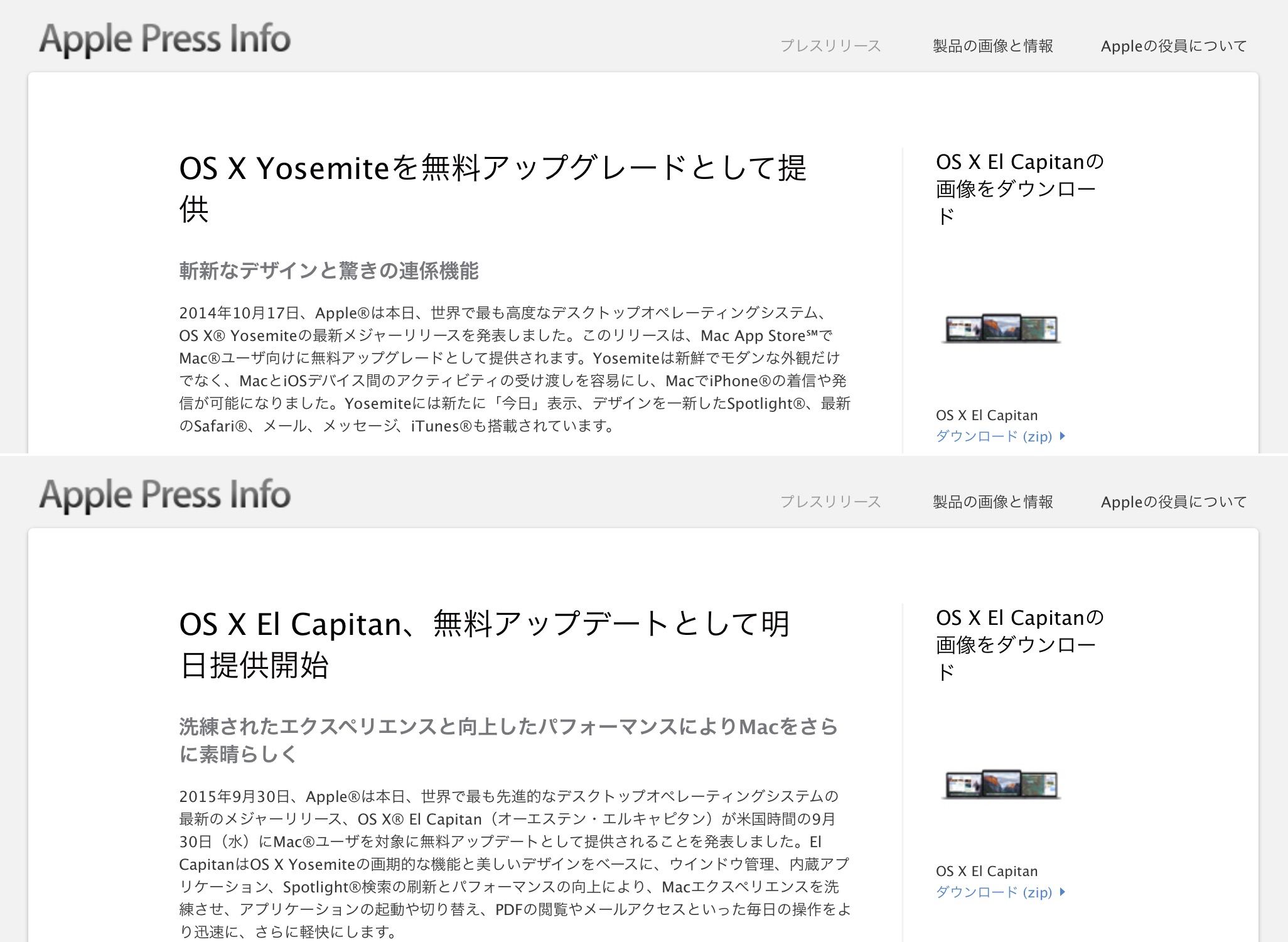 AppleはEl Capitanへの移行をアップデートと呼んでおり、昨日公開された日本語・英語のプレスリリースにも「アップデート」と記載されているため、こちらの表記にそろえています[Yosemite, El Capitan]。