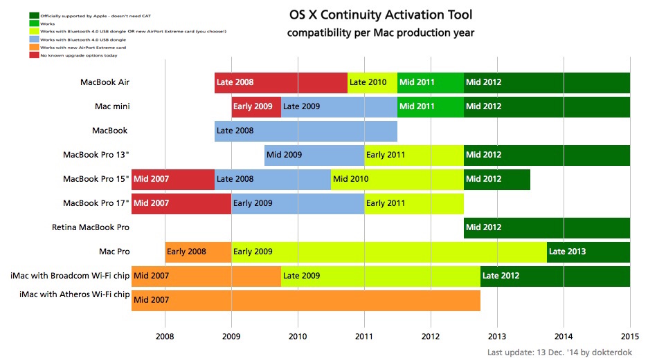 これはあくまでも最低システム要件のため、iOSデバイスと同様に古いMacでは既にYosemiteの新機能として提供されたAirDropやHandoff, Instant HotspotなどContinuityと呼ばれる機能が利用できなくなっています。これは各デバイスがBluetooth 4.0 (LE)に対応していないことが原因で、Continuityに関してはBluetoothドングルを利用し無理やり利用することが可能でしたが、