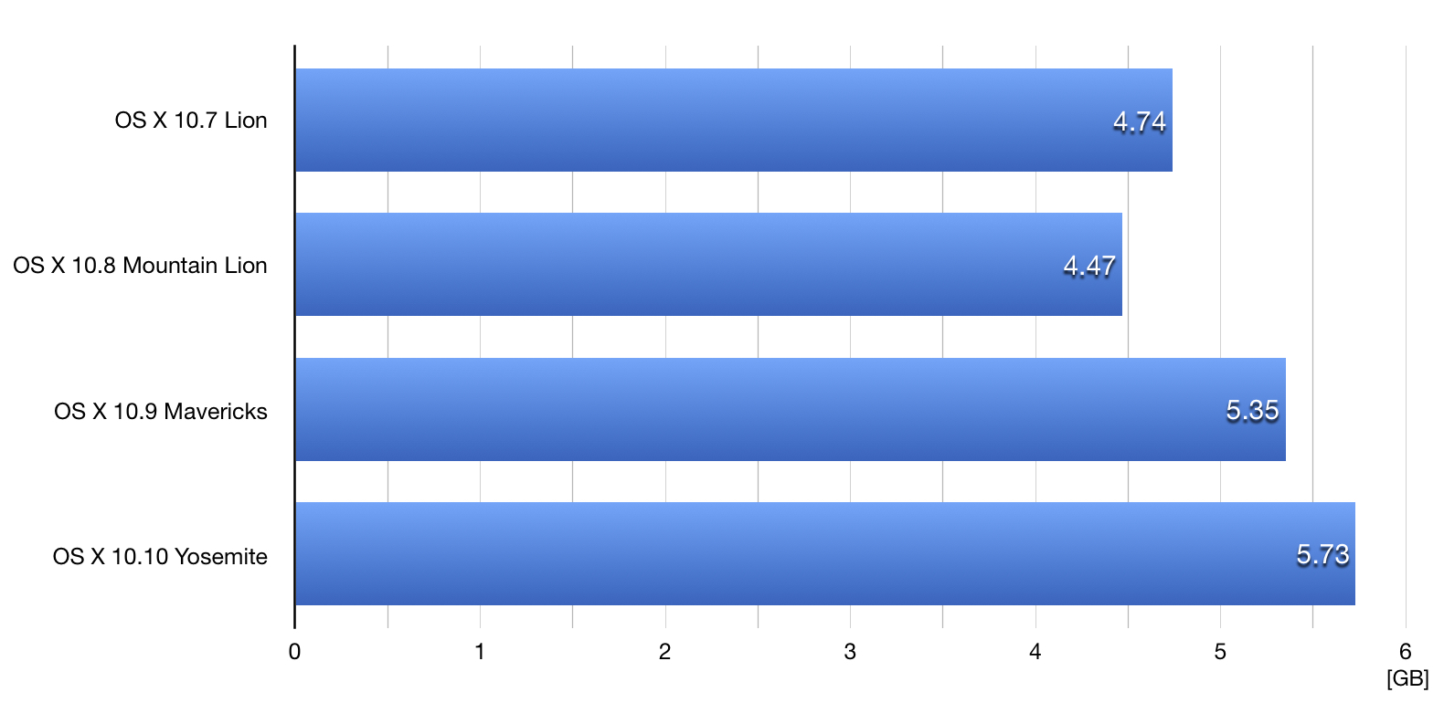 iOS 9ではアップデートに必要なストレージスペースがiOS 8の5GB以上から1.3GBと大幅に削減され話題になりましたが、OS Xのインストーラについては徐々に増加しており、OS X 10.9 Mavericksでは5GBを超え、