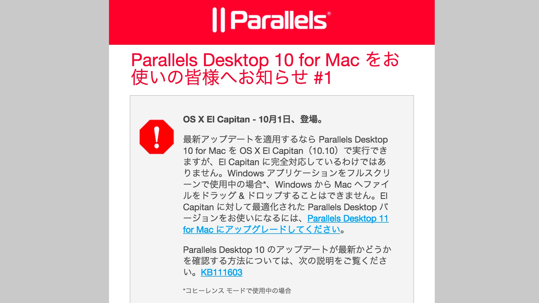 ParallelsがOS X 10.11 El Capitanでは「Parallels Desktop 10 for Mac」の一部機能が利用できないことをユーザーに通知しています。詳細は以下から。