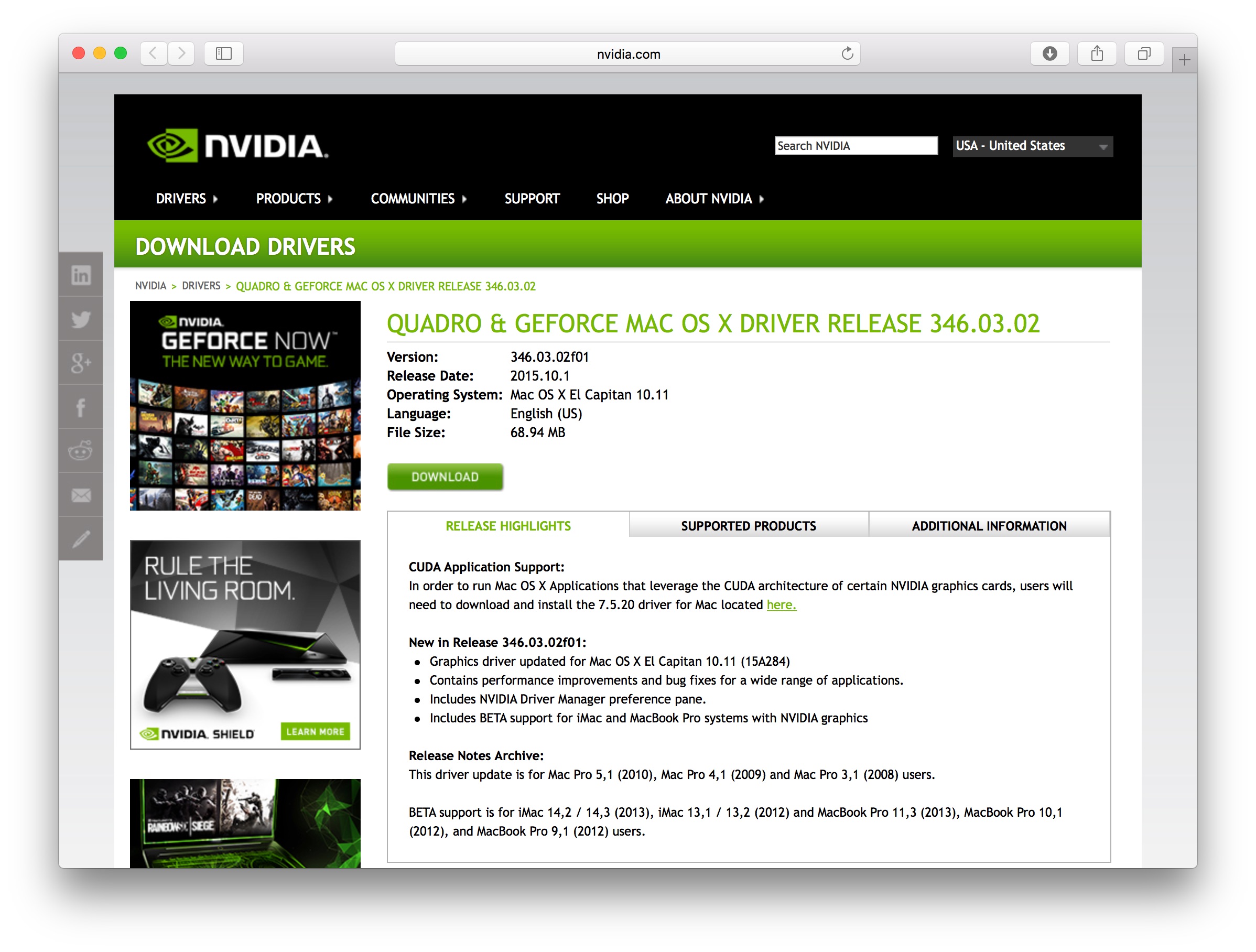 [NVIDIA DRIVERS Quadro & GeForce Mac OS X Driver Release 346.03.02 – NVIDIA]
