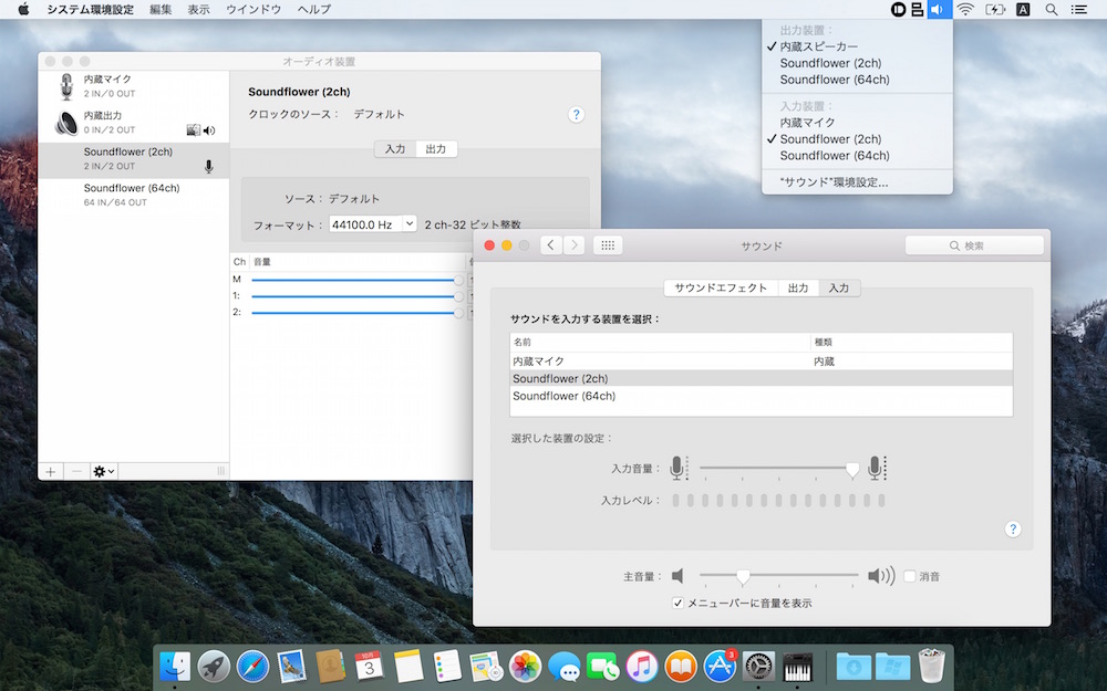 Soundflowerの開発は止まっているようですがオープンソース(MIT)のため、複数の開発者の方がMavericksやYosemite対応版を公開しており、El CapitanではMatt Ingallsさんが開発しているSoundflower 2.0b2が利用可能でした。