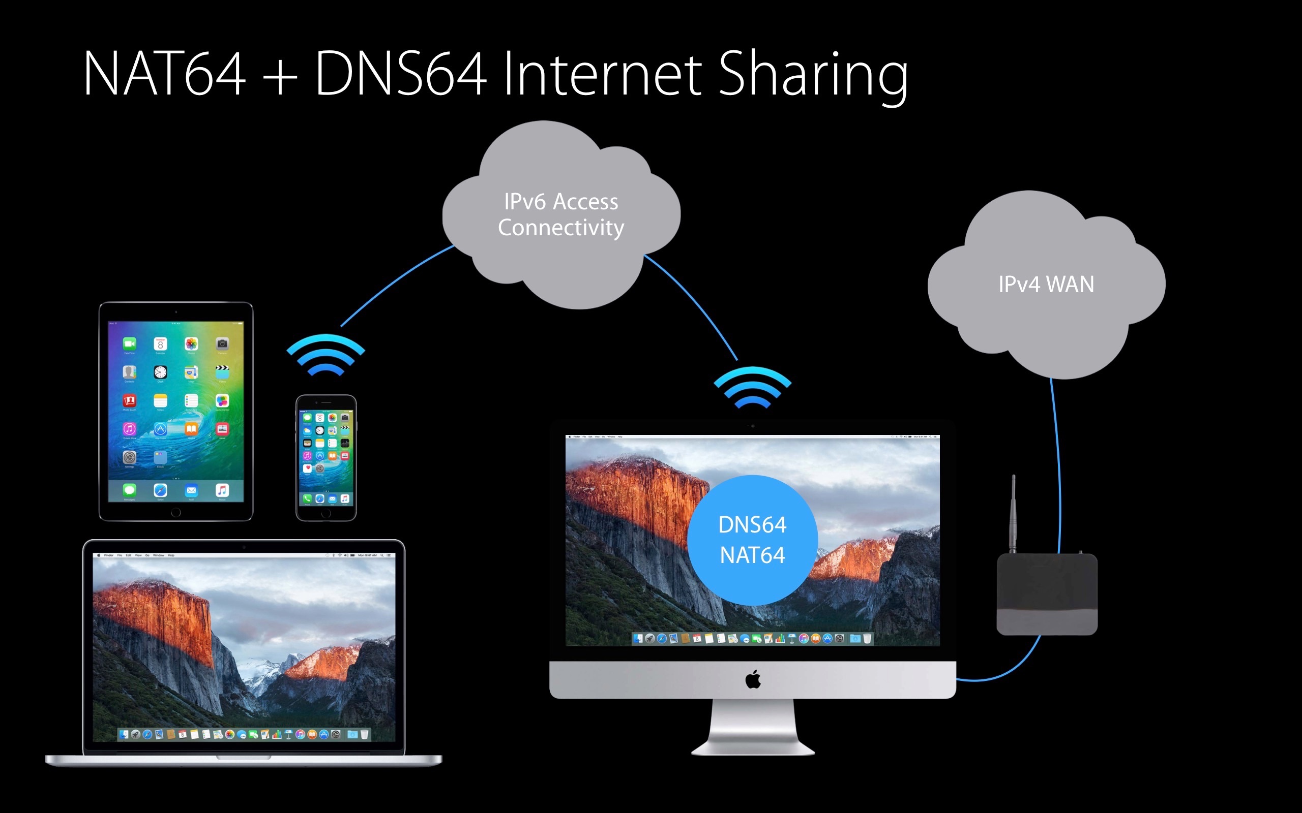 AppleはiOS 9とOS X 10.11からIPv6をメインストリームにネットワーク周りの開発を行っており既に”Happy Eyeballs“アルゴリズムの変更を行っていますが、これにより今後はiOSアプリもIPv6への対応を求めています(詳しくは公式およびQiitaへ)。そこでAppleはEl Capitanのインターネット共有のオプションに「NAT64ネットワークの作成」 を追加、IPv6のテスト環境を構築できるようにしています。