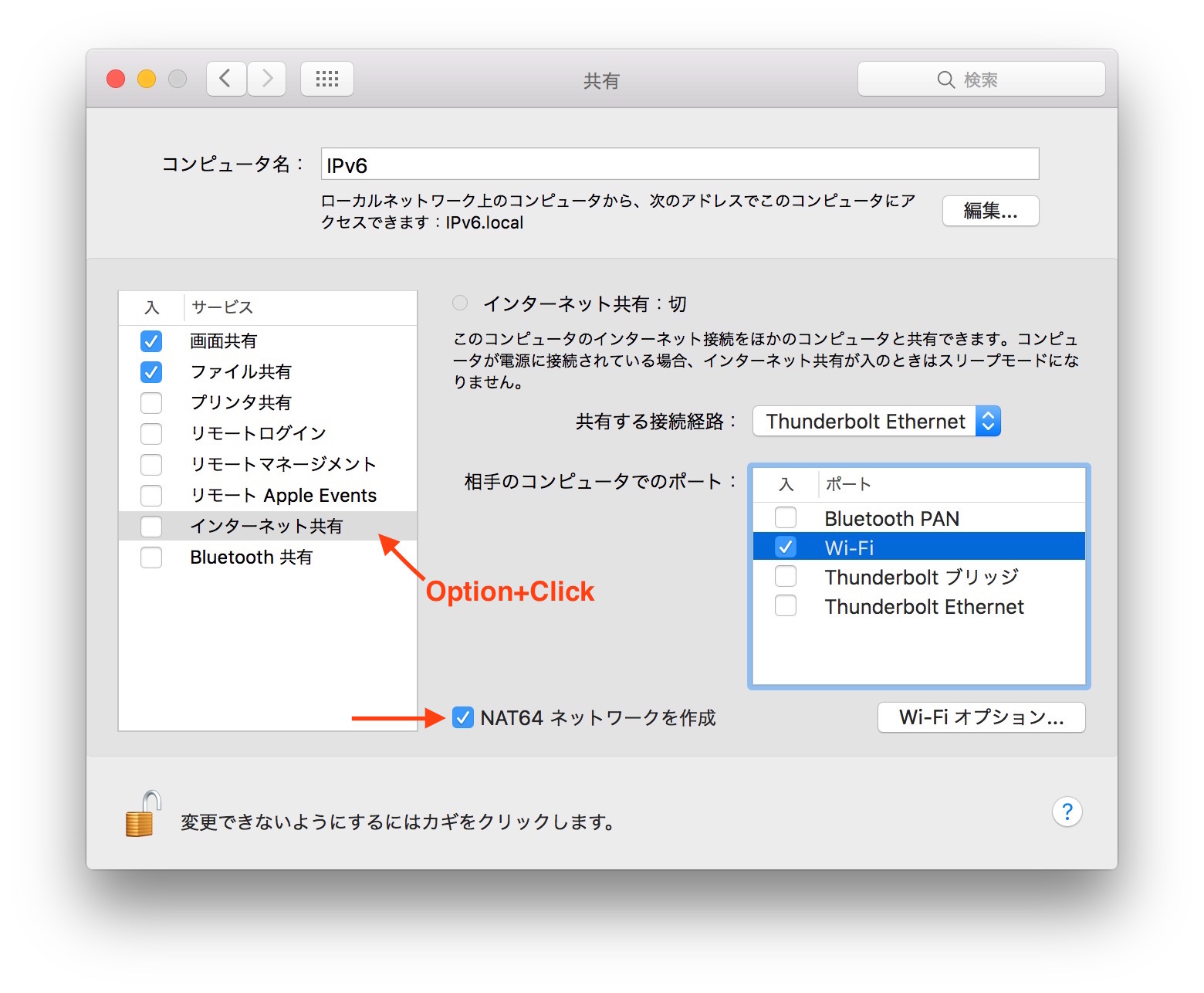 次にシステム環境設定の[共有]項目を開き、[Option]キーを押したまま「インターネット共有」サービスをクリックします。すると中央下に「NAT64ネットワークを作成」というオプションが現れるので、チェックを入れ「共有する接続経路」に[Ethernet]を、「相手のコンピュータでのポート」に[Wi-Fi]をそれぞれ選択。後はWi-Fiオプションからネットワークの名前やパスワードなどを設定すれば、IPv6ネットワークのテスト環境が構築できます。