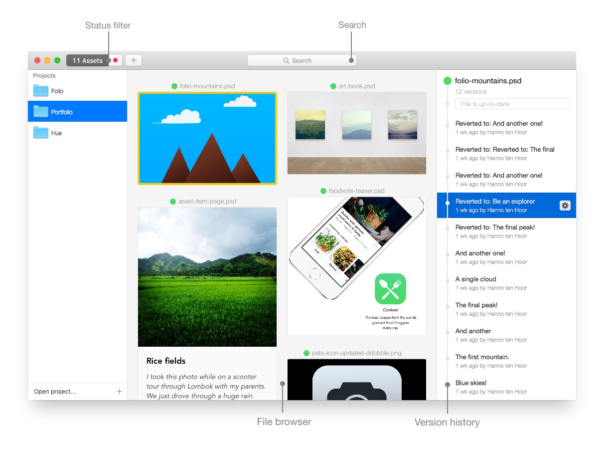 OS XにはTime Machineや独自のバージョン管理機能がありますが、これらでデザイナー向けアプリのファイルを管理するとロードが遅い上にどこで編集したか分からないためFolio for Macを開発したそうで、Folio for Macにはプロジェクトとバージョン履歴、リアルタイムファイルブラウザ、検索ウィンドウが設置されており、