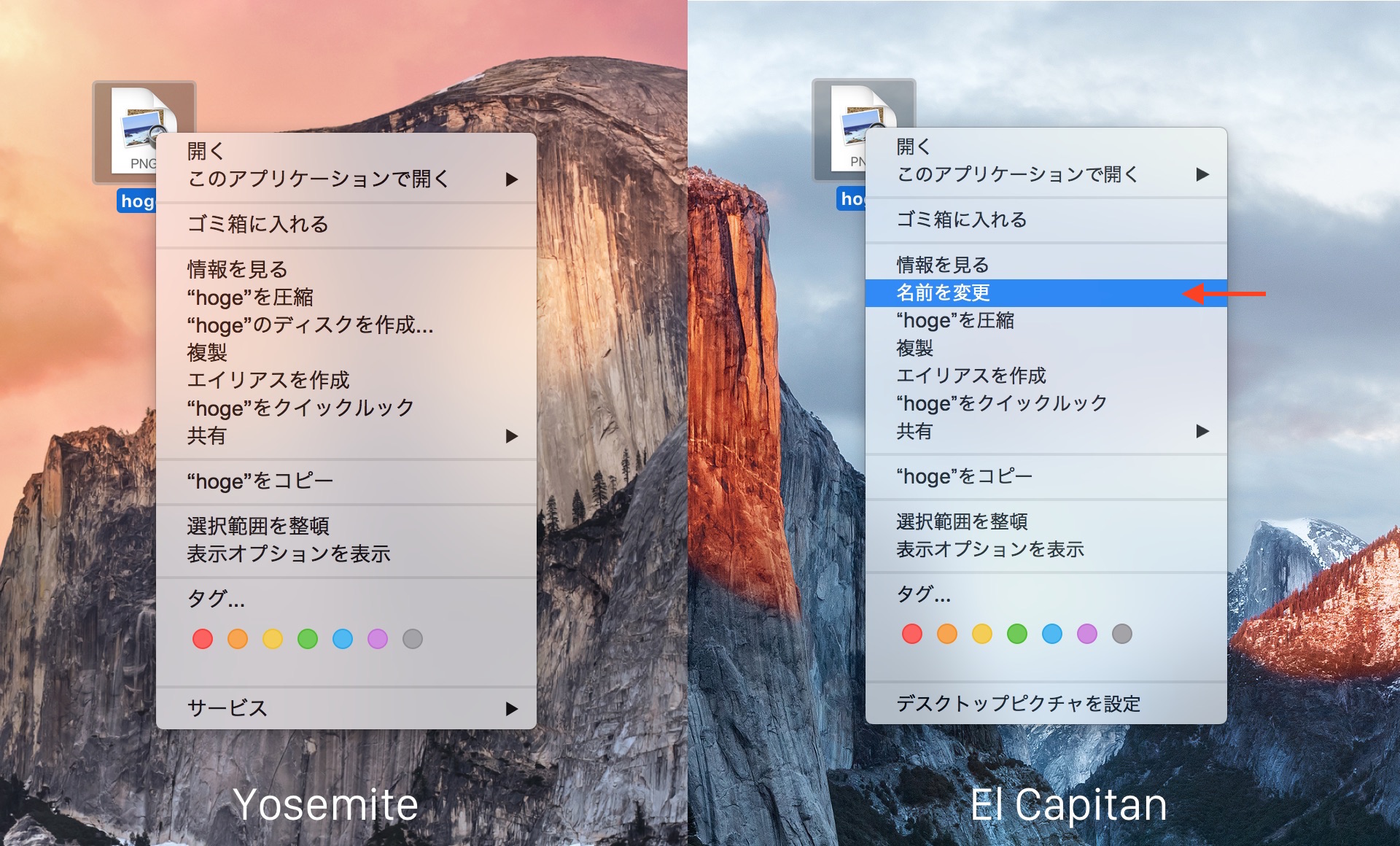 El Capitanではターミナルアプリで新しいTTY設定やブックマーク機能が追加され、Mac App Storeアプリでは無料のアプリをパスワード認証無しにダウンロードできるなど細かいアップデートがなされていますが、Finderのコンテキストメニューにも新たに「名前を変更」のメニューが追加されています。
