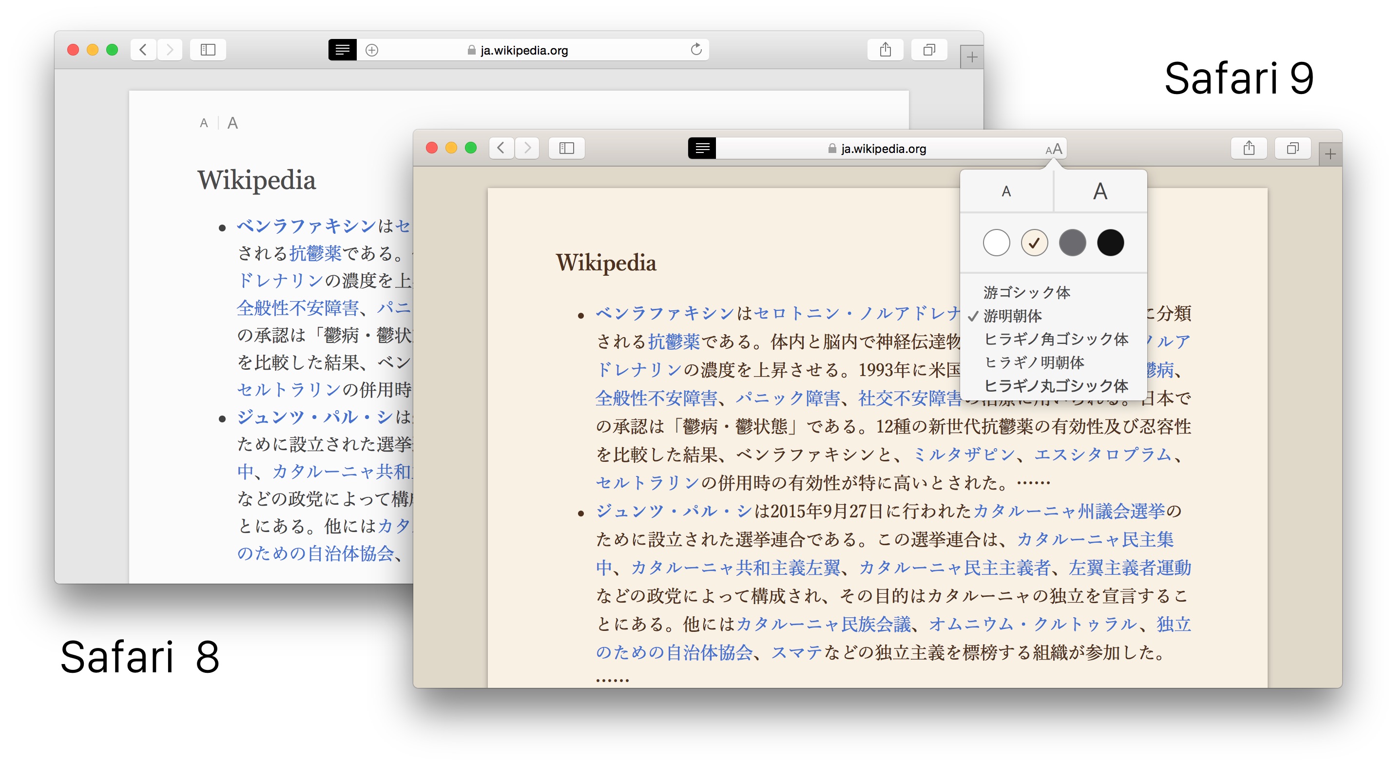 Safari 9ではリーダー機能でカラーテーマや「游ゴシック体」「ヒラギノ丸ゴシック体」などのフォントが選択可能になっています。詳細は以下から。
