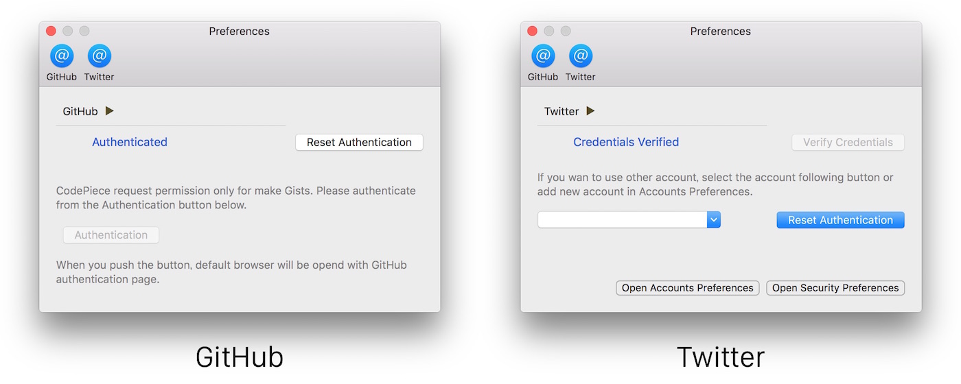 CodePieceは熊谷 友宏さんが開発しているTwitterおよびGitHubと連携し、コードをツイートおよびgistへ投稿できるアプリです。使い方はアプリを起動しPreferencesからTwitterとGitHubアカウントを認証。