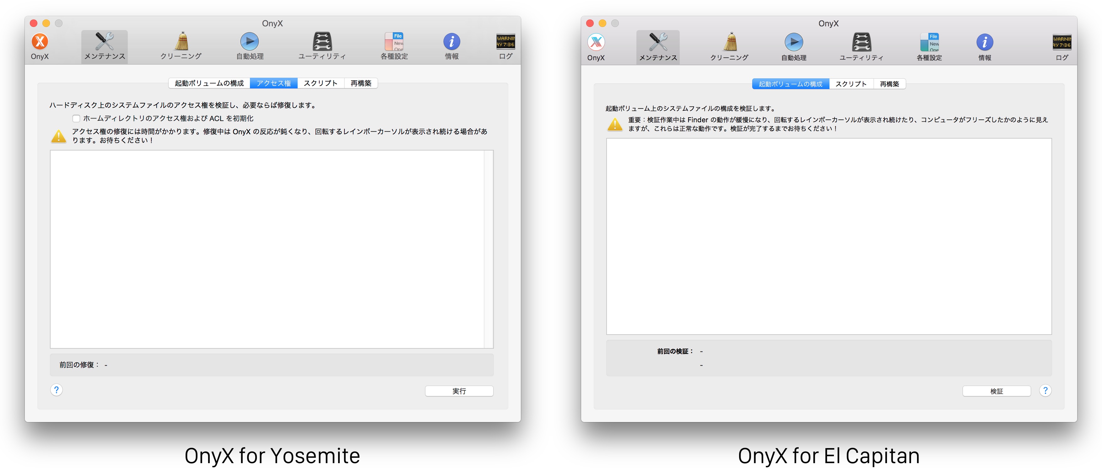 OnyX v3.1ではEl Capitanのディスクユーティリティから削除された「アクセス権の検証/修復」が、OnyXのメンテナンスタブからも削除された他はYosemite用のOnyX[1, 2]と変わりなく、引き続き多くのオプションが利用できるので、El Capitanのメンテナンスをしたい方は公式サイトへどうぞ。