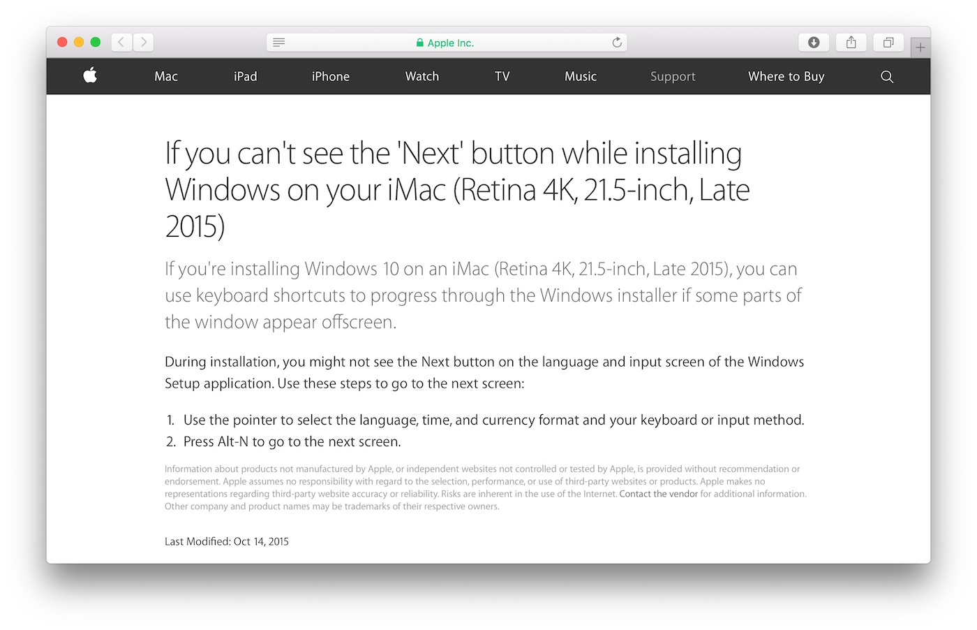 AppleがiMac (Retina 4K, 21.5-inch, Late 2015)にWindowsをインストールするさい「次へ」ボタンが表示されない不具合があるとサポートページを公開しています。詳細は以下から。