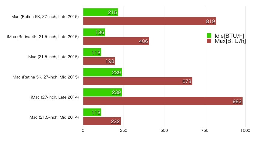 また、Max時の消費電力がについては、新しいiMac (Retina 5K, 27-inch, Late 2015)モデルにはIntelの第6世代Coreプロセッサ「Skylake」が採用され全大抵にTDPが低くなっているものの、今回のデータは新しいiMac Retina 5KがTDP 91W、古いiMac Retina 5Kが84WのCPUが利用されているため、前者の方が高くなっているようです。
