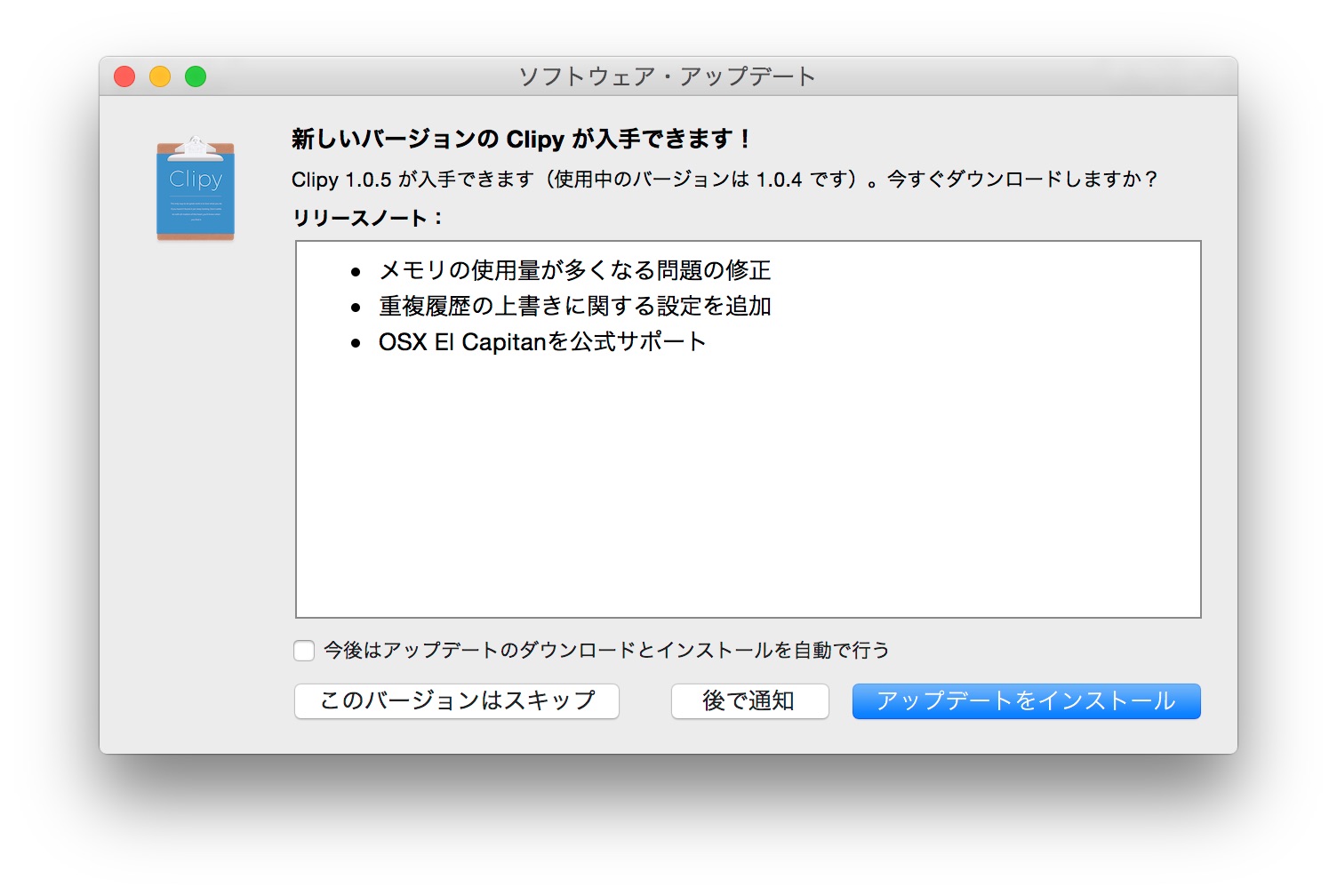 ClipMenuベースのクリップボード拡張アプリ「Clipy」がOS X 10.11 El Capitanに対応したアップデートを配布しています。詳細は以下から。