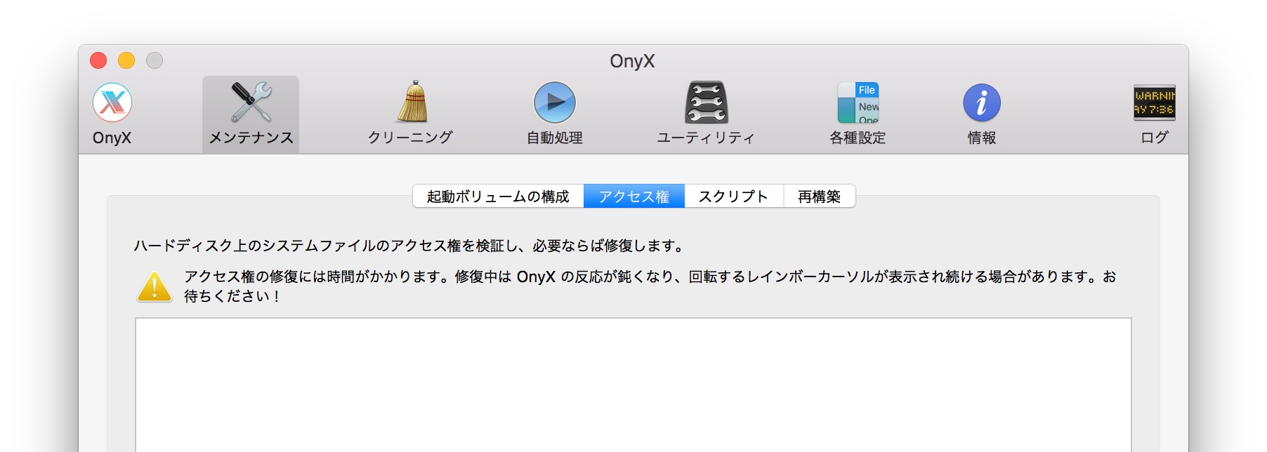 新たにアップデートされたMacのメンテナンスユーティリティアプリ「OnyX v3.1.1」ではこのディスクのアクセス権の検証/修復をマニュアルで行えるようになっており、「メンテナンス」および「自動処理」タブからアクセス権の修復が行えるようになっています。