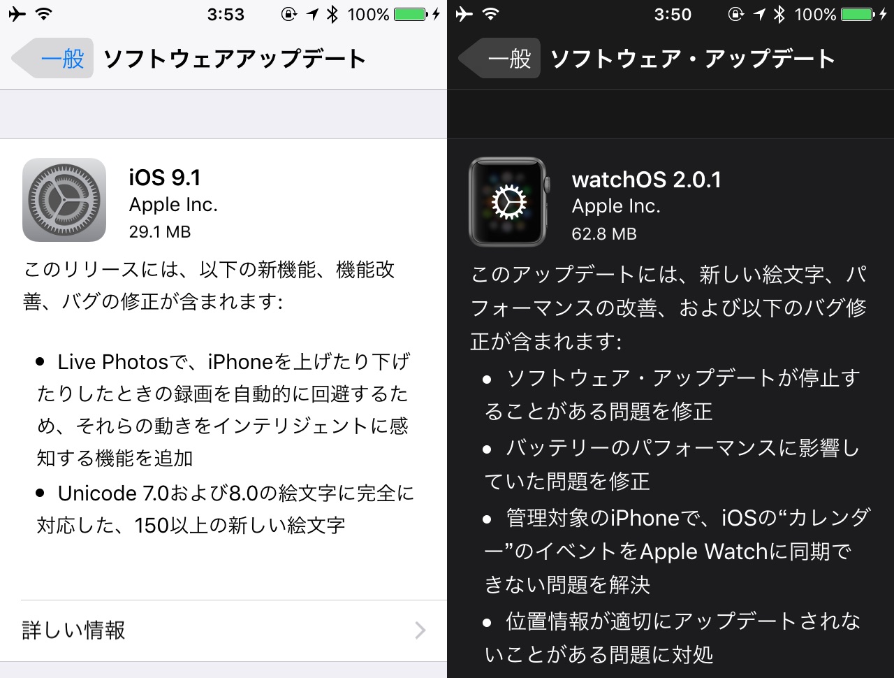 AppleがiOS 9.1 および watchOS 2.0.1をリリースしています。詳細は以下から。