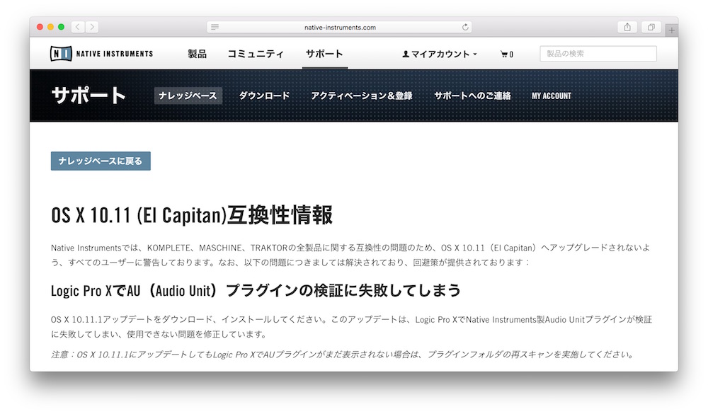 AppleはOS X 10.11.1で「特定のAudio Unit プラグインが正常に機能しない問題」を解決したと発表していましたが、これに伴いNative Instrumentsは互換性情報のサポートページを更新し、Logic Pro XでNI製AUプラグインが検証できない問題が修正されたと発表しています。