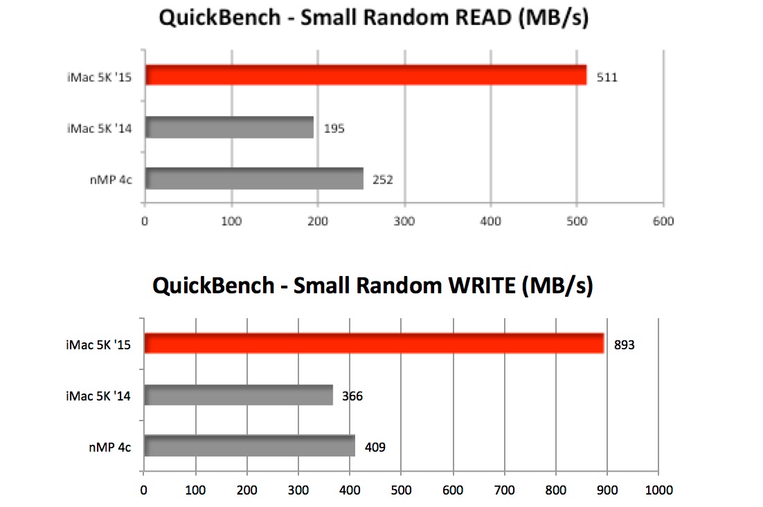 また、QuickBenchベンチマークでは4Kから1024Kの小さなファイルサイズのランダムRead/Writeスコアを測定しており、こちらもiMac Retina 5K Late 2015モデルがLate 2014の約2.5倍、Mac Pro (Late 2013)の約2倍以上となっています。