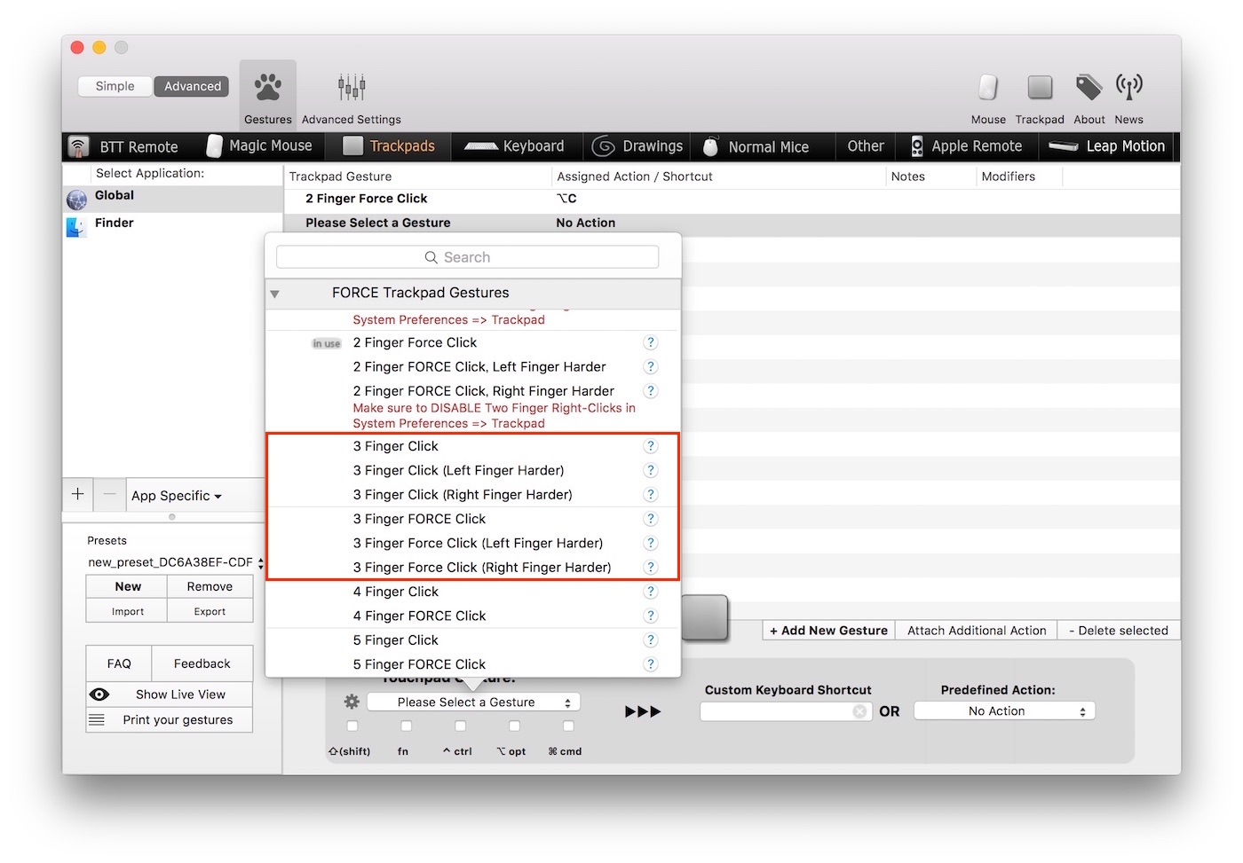 – Added gestures for Force Trackpads: Three Finger Click (Left Finger Harder) & Three Finger Click (Right Finger Harder) and Three Finger FORCE Click (Left Finger Harder) & Three Finger FORCE Click (Right Finger Harder)