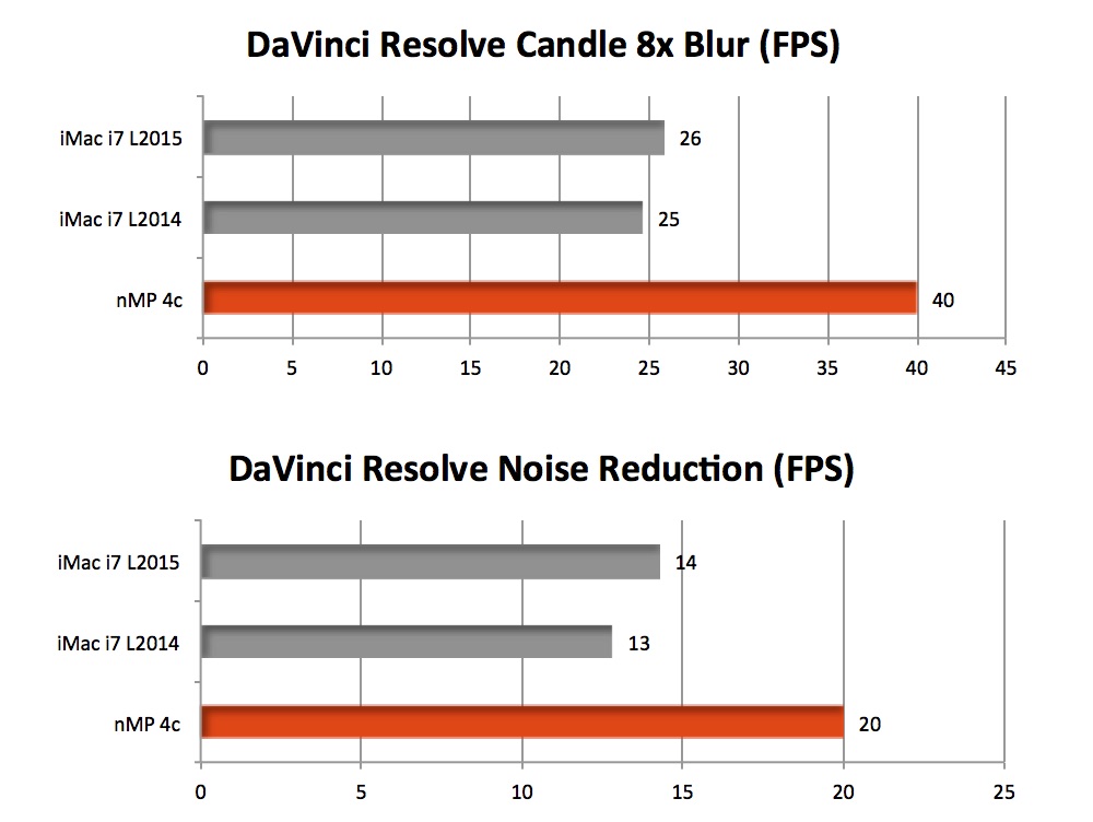And for a reality check, you can see that the ‘late 2013’ Quad-Core Mac Pro’s dual FirePro D300s combine to beat both mobile GPUs when running a pro app like DaVinci Resolve that fully utilizes both D300s to render blur and noise reduction on the fly.