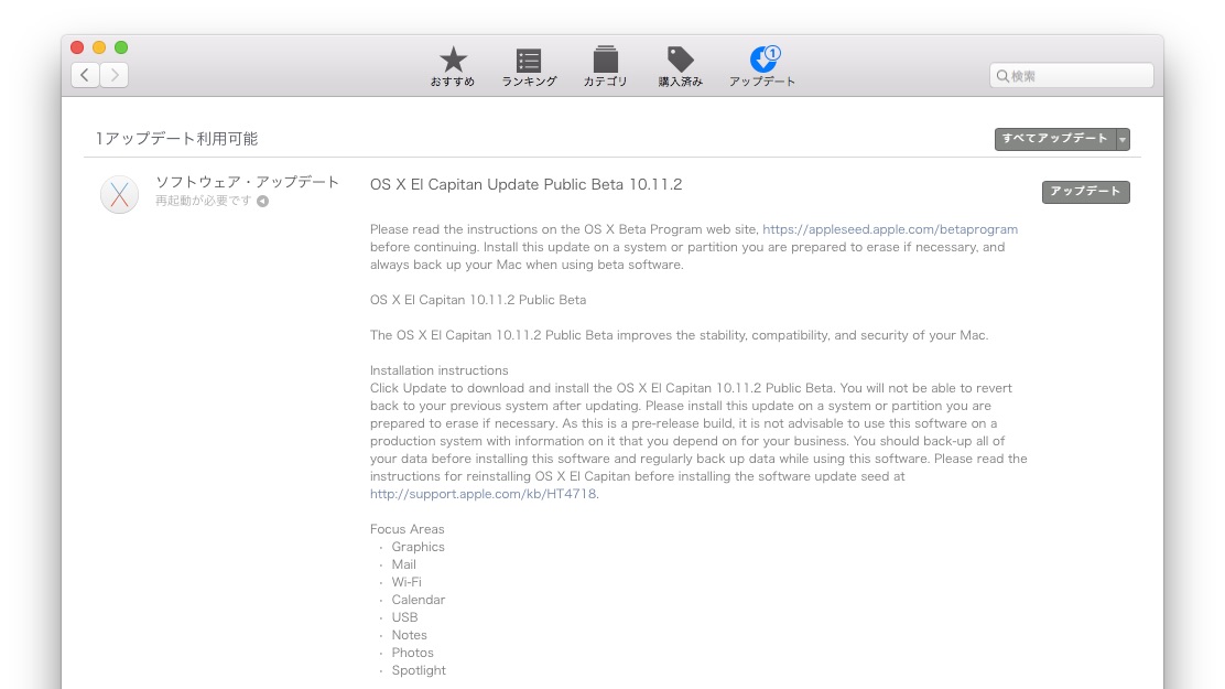 Appleは先日 開発者向けに「OS X El Capitan Update Developer Beta 10.11.2」を公開しましたが、今日新たにBeta Software Programメンバー向けにもOS X 10.11.2初のBeta版となる「OS X El Capitan Update Public Beta 10.11.2」アップデートを公開しています。