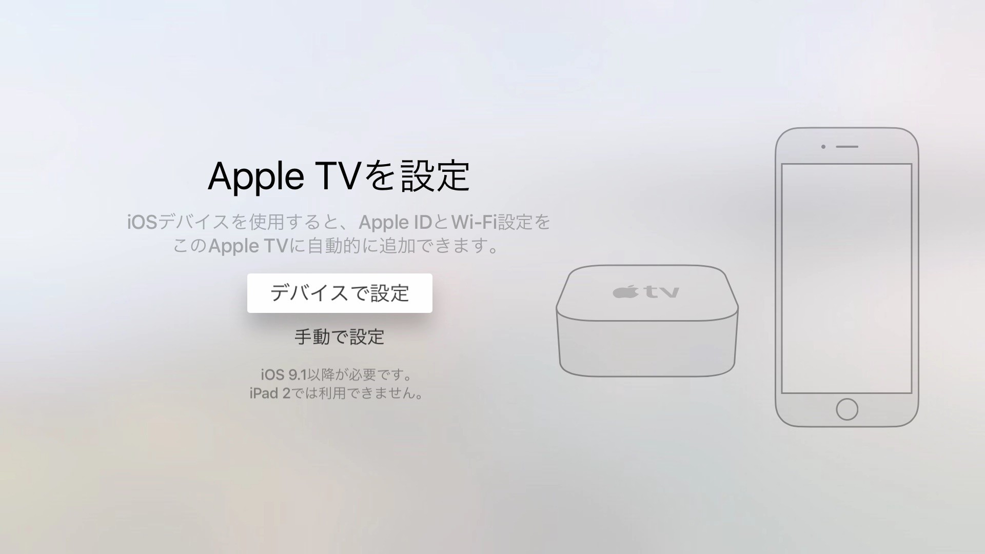 さらにApple IDやWi-Fiのパスワードを入力する煩わしい作業は、使用したいApple IDやWi-Fiの情報が設定されているiOSデバイス(iOS 9.1以降)のBluetoothをONにし、Apple TVに近づけるだけで設定情報をApple TVに送ってくれます。