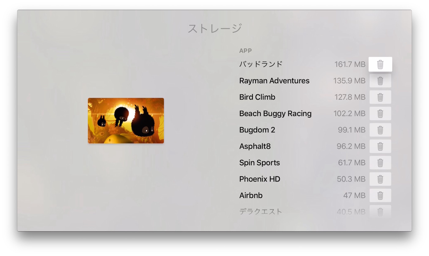 2つ目はtvOSの設定アプリから[一般] > [ストレージを確認] へ進むとApple TV (第4世代)にインストールされているアプリの一覧がサイズ順に表示されているので、この中から削除したいtvOSアプリを選択しごみ箱アイコンをクリックし削除します。