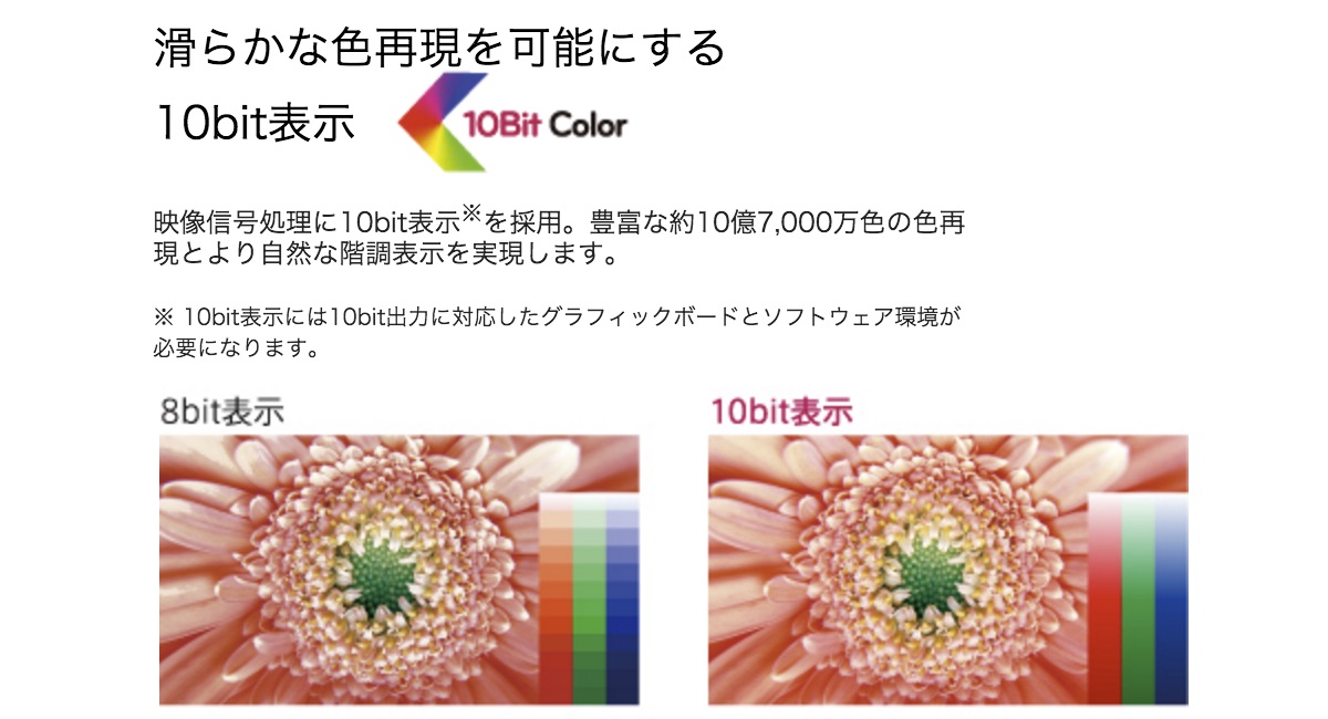 ビット深度10bitの場合2^(10*3) = 1,073,741,824色と約10億7000万の色を表現できることになり、より自然な階調表示が可能で、その違いはA/Bテストなどでもはっきりと確認できるそうです(下図 左側がビット深度10bit、右側がビット深度8bit)。