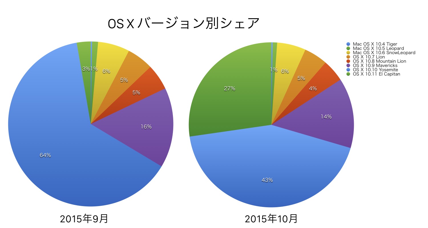 El Capitanのシステム条件は「Mac OS X 10.6 Snow Leopardが搭載された2007年製以降のMac」となっており、Snow Leopardのシェアも動くかと思われましたが、やはりRosettaの需要が大きいのか今だに6%台とOS X 10.7 Lion (5%), 10.8 Mountain Lion (4%)のシェアより大きくなっています。