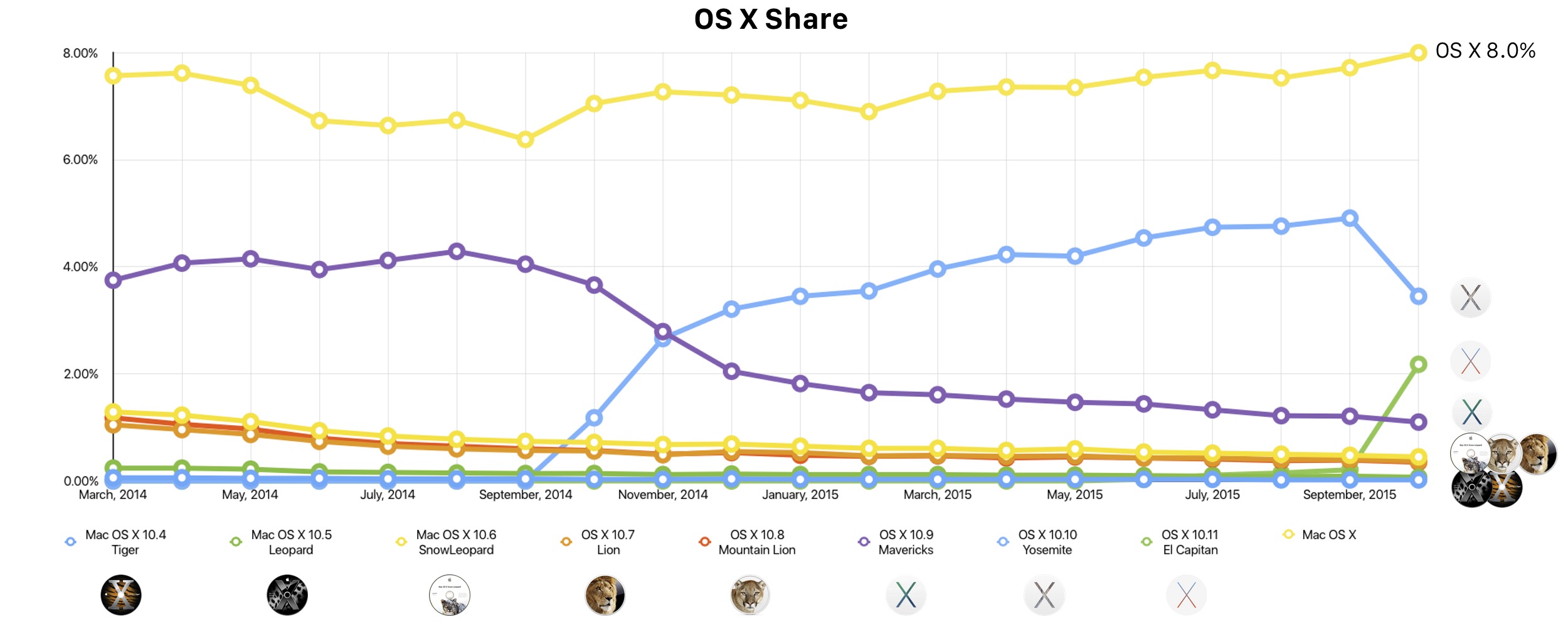El Capitanのシェアはリリース後1ヶ月でOS X全体の27%に達しており、OS X 10.7 Lion以降のシェアは全て減少傾向にあります。