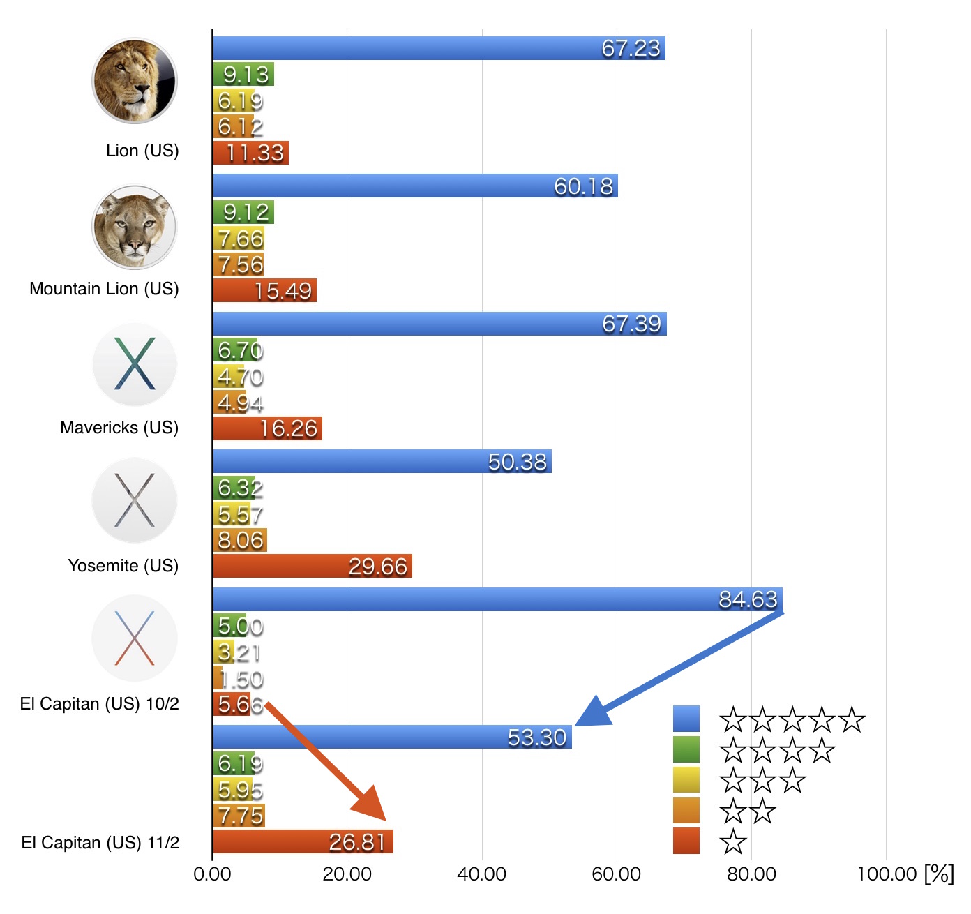 El Capitanのカスタマー評価はリリース後1ヶ月で様々な不具合が発見され始めたことから低下していますが、Appleは現在のBeta版でこれらの不具合をフォーカスエリアに指定し修正を行うようなので、OS X 10.11.2がリリースされればEl Capitanがさらに普及すると思われます。
