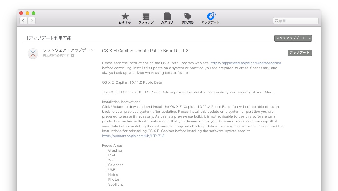 Appleは現地時間11月04日、Apple、Beta Software Programメンバー向けに「OS X El Capitan Update Public Beta 10.11.2」の2nd Betaを公開しています。このBeta版ではOS Xの安定とセキュリティが向上する一方、グラフィック、メール、Wi-Fi、カレンダー、USB、メモ、写真、Spotlightをフォーカスエリアに指定しており、ユーザーにレポートを求めています。