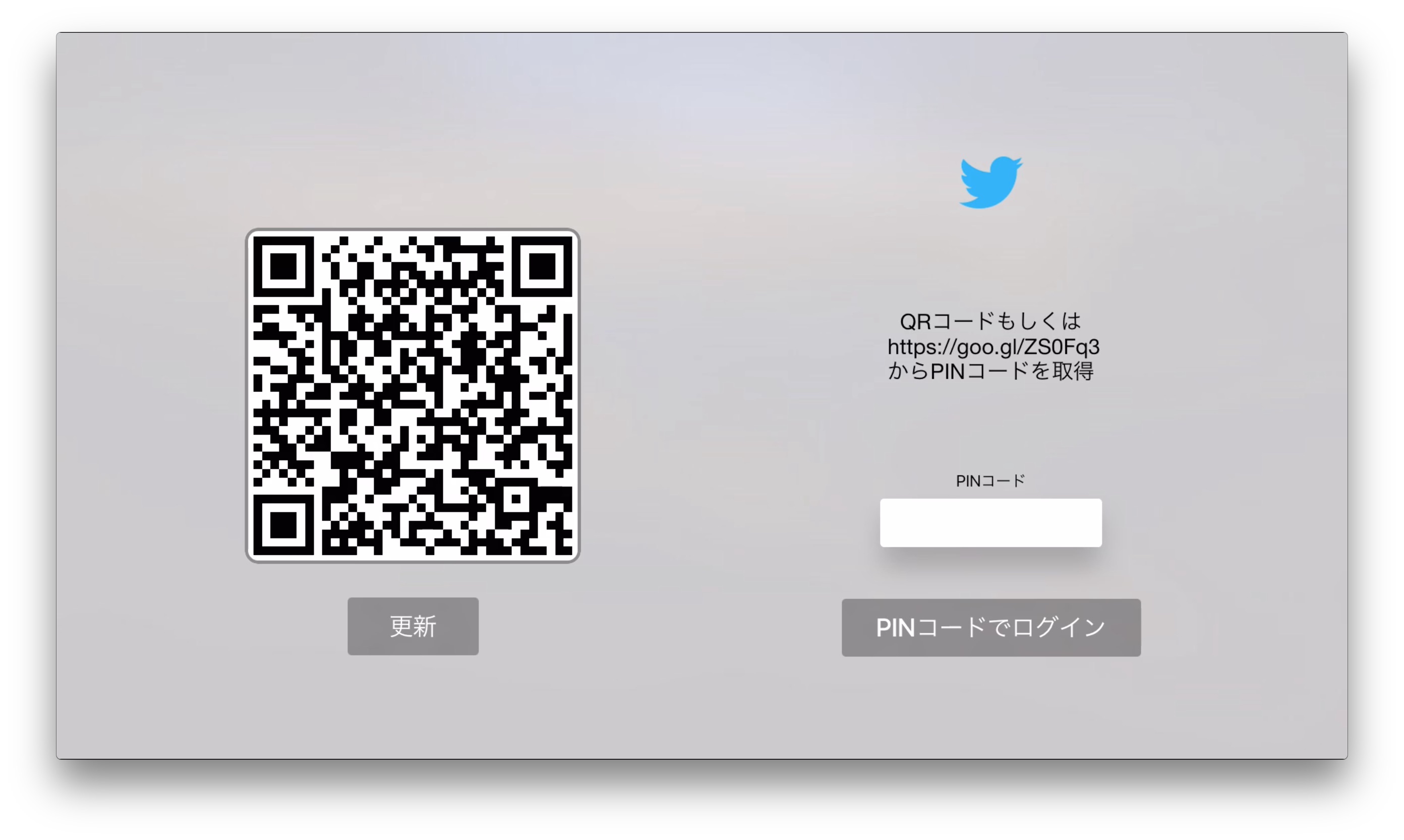 Apple TV (第4世代)は現在のところブラウザ機能を持たないため、TwitterへのログインにはMacやiPhoneなどのブラウザを利用しPINコードを取得します。